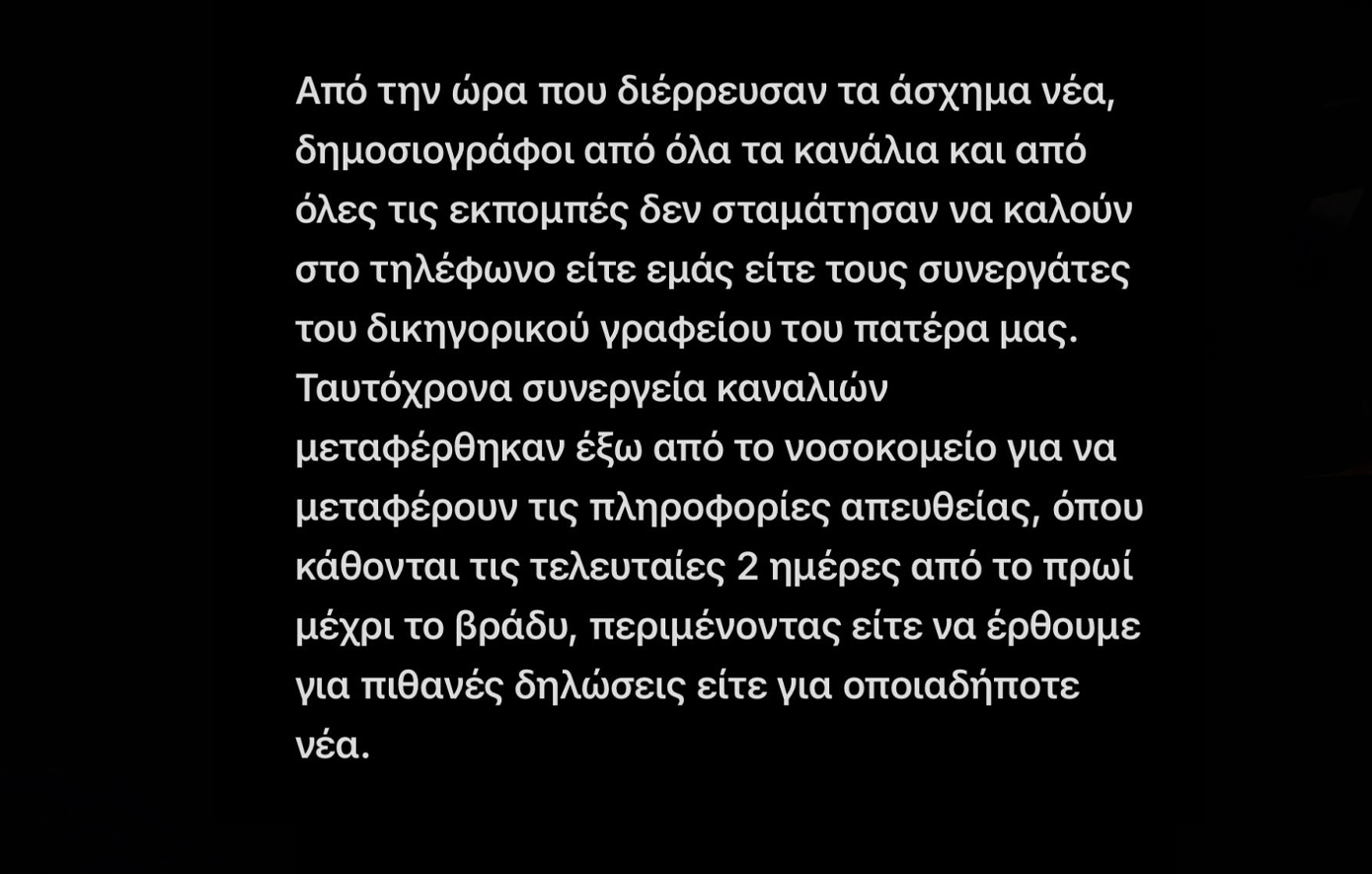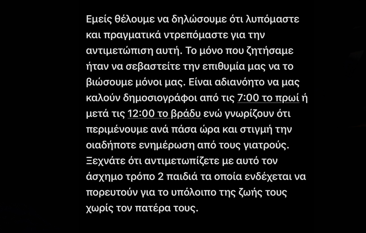 Εμείς θέλουμε να δηλώσουμε ότι λυπόμαστε και πραγματικά ντρεπόμαστε για την αντιμετώπιση αυτή. Το μόνο που ζητήσαμε ήταν να σεβαστείτε την επιθυμία μας να το βιώσουμε μόνοι μας. Είναι αδιανόητο να μας καλούν δημοσιογράφοι από τις 7:00 το πρωί ή μετά τις 12:00 το βράδυ, ενώ γνωρίζουν ότι περιμένουμε ανά πάσα ώρα και στιγμή την οποιαδήποτε ενημέρωση από τους γιατρούς. Ξεχνάτε ότι αντιμετωπίζετε με αυτό τον άσχημο τρόπο δύο παιδιά, τα οποία ενδέχεται να πορευτούν για το υπόλοιπο της ζωής τους χωρίς τον πατέρα τους.