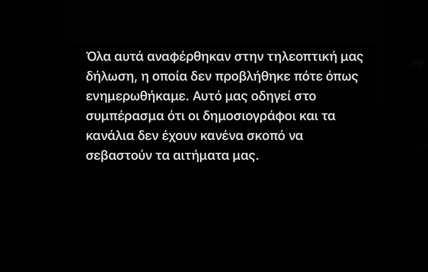 «Όλα αυτά αναφέρθηκαν στην τηλεοπτική μας δήλωση, η οποία δεν προβλήθηκε ποτέ, όπως ενημερωθήκαμε. Αυτό μας οδηγεί στο συμπέρασμα ότι οι δημοσιογράφοι και τα κανάλια δεν έχουν κανένα σκοπό να σεβαστούν τα αιτήματά μας. Λόγω αυτού δηλώνουμε για τελευταία φορά ότι δεν θα επιτραπεί από την οικογένειά μας και τους συνεργάτες του δικηγορικού γραφείου του πατέρα μας να μετατρέψετε τις ενδεχομένως τελευταίες στιγμές του σε ένα reality.