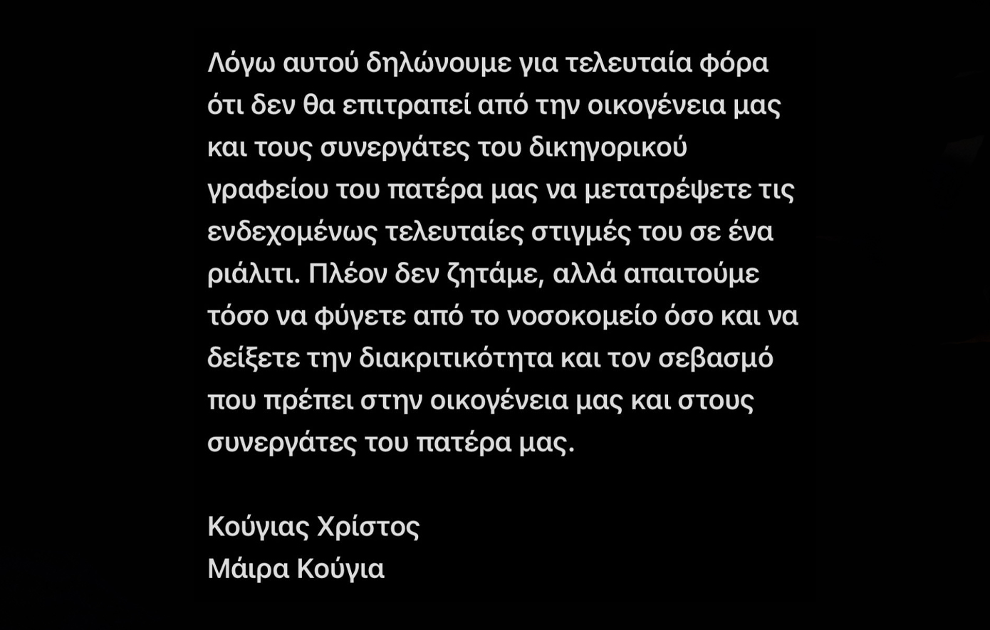 Πλέον, δεν ζητάμε, αλλά απαιτούμε, τόσο να φύγετε από το νοσοκομείο, όσο και να δείξετε τη διακριτικότητα και τον σεβασμό που πρέπει στην οικογένειά μας και στους συνεργάτες του πατέρα μας. Χρίστος και Μάιρα Κούγια».