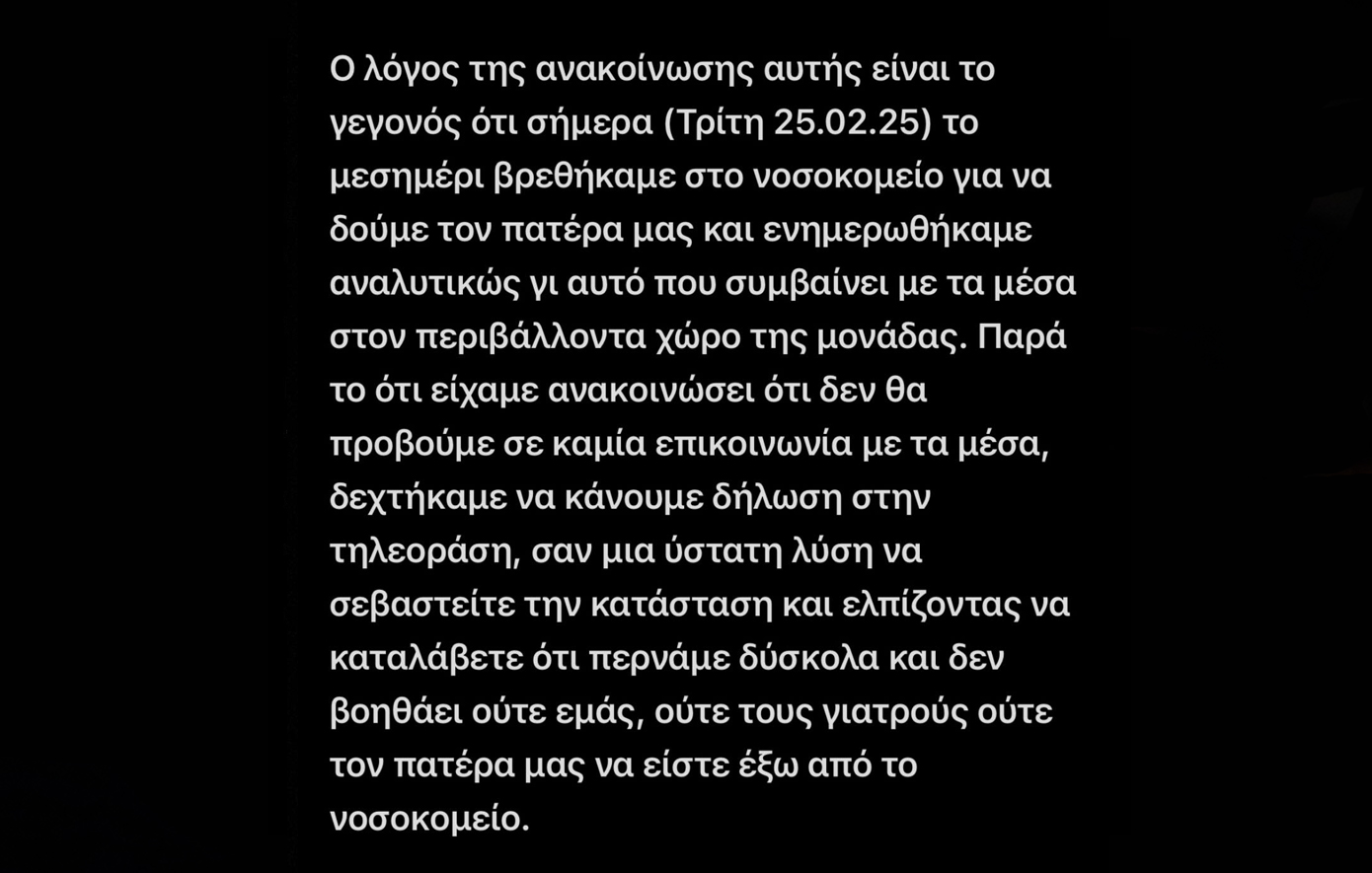 Ο λόγος της ανακοίνωσης αυτής είναι το γεγονός ότι σήμερα (Τρίτη 25.02.25) το μεσημέρι βρεθήκαμε στο νοσοκομείο για να δούμε τον πατέρα μας και ενημερωθήκαμε αναλυτικώς γι’ αυτό που συμβαίνει με τα Μέσα στον περιβάλλοντα χώρο της μονάδας. Παρά το ότι είχαμε ανακοινώσει ότι δεν θα προβούμε σε καμία επικοινωνία με τα Μέσα, δεχτήκαμε να κάνουμε δήλωση στην τηλεόραση, σαν μια ύστατη λύση να σεβαστείτε την κατάσταση και ελπίζοντας να καταλάβετε ότι περνάμε δύσκολα και δεν βοηθάει ούτε εμάς, ούτε τους γιατρούς, ούτε τον πατέρα μας να είστε έξω από το νοσοκομείο.