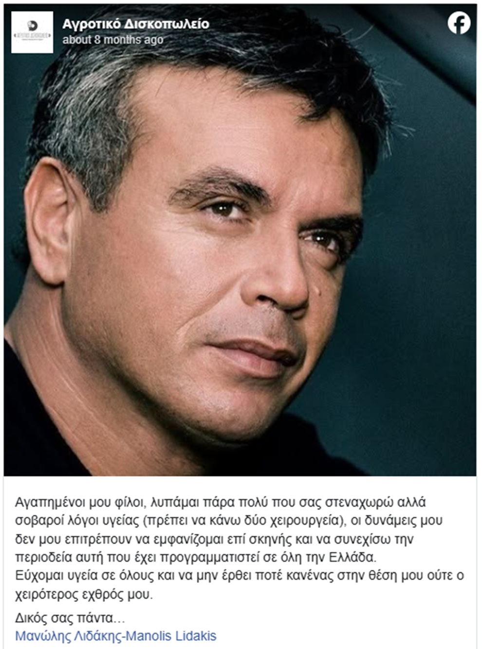 Ο αγαπημένος τραγουδιστής Μανώλης Λιδάκης έφυγε σήμερα από τη ζωή σε ηλικία 65 ετών, ενώ το τελευταίο διάστημα αντιμετώπιζε σοβαρά προβλήματα υγείας.