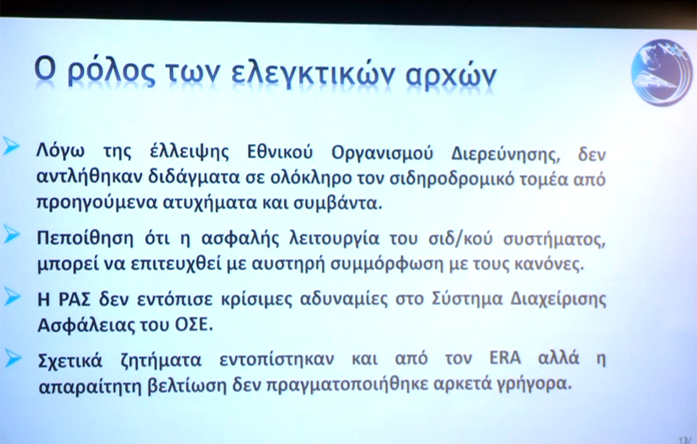 Τα ευρήματα αναδεικνύουν απουσία δικλίδων ασφαλείας στον ΟΣΕ ώστε να διορθώνονται τυχόν ανθρώπινα λάθη, σοβαρά προβλήματα όσον αφορά την εκπαίδευση και την αξιολόγηση του προσωπικού στον ΟΣΕ, που είναι υπεύθυνος για το δίκτυο, και στην Hellenic Train, η οποία εκτελεί τα δρομολόγια, αλλά και τις ανεπάρκειες της Ρυθμιστικής Αρχής Σιδηροδρόμων (ΡΑΣ), η οποία έχει την εποπτική ευθύνη.