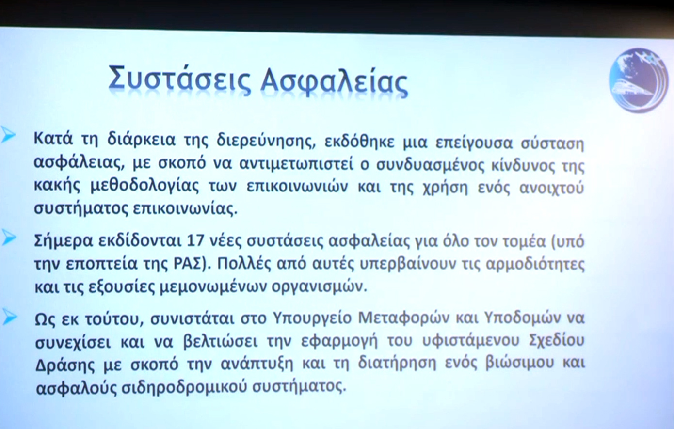 Πρώτος ομιλητής για την εισαγωγή και παρουσίαση του έργου του ΕΟΔΑΣΑΑΜ και της Επιτροπής Διερεύνησης ήταν ο πρόεδρος του σιδηροδρομικού τομέα του ΕΟΔΑΣΑΑΜ, Χρήστος Παπαδημητρίου. Μίλησαν επίσης τα μέλη της Επιτροπής Διερεύνησης, Bart Accou, Fabrizio Carpinelli (στελέχη ERA) και Κώστας Καπετανίδης (προϊστάμενος μονάδας διερευνήσεων ΕΟΔΑΣΑΑΜ).