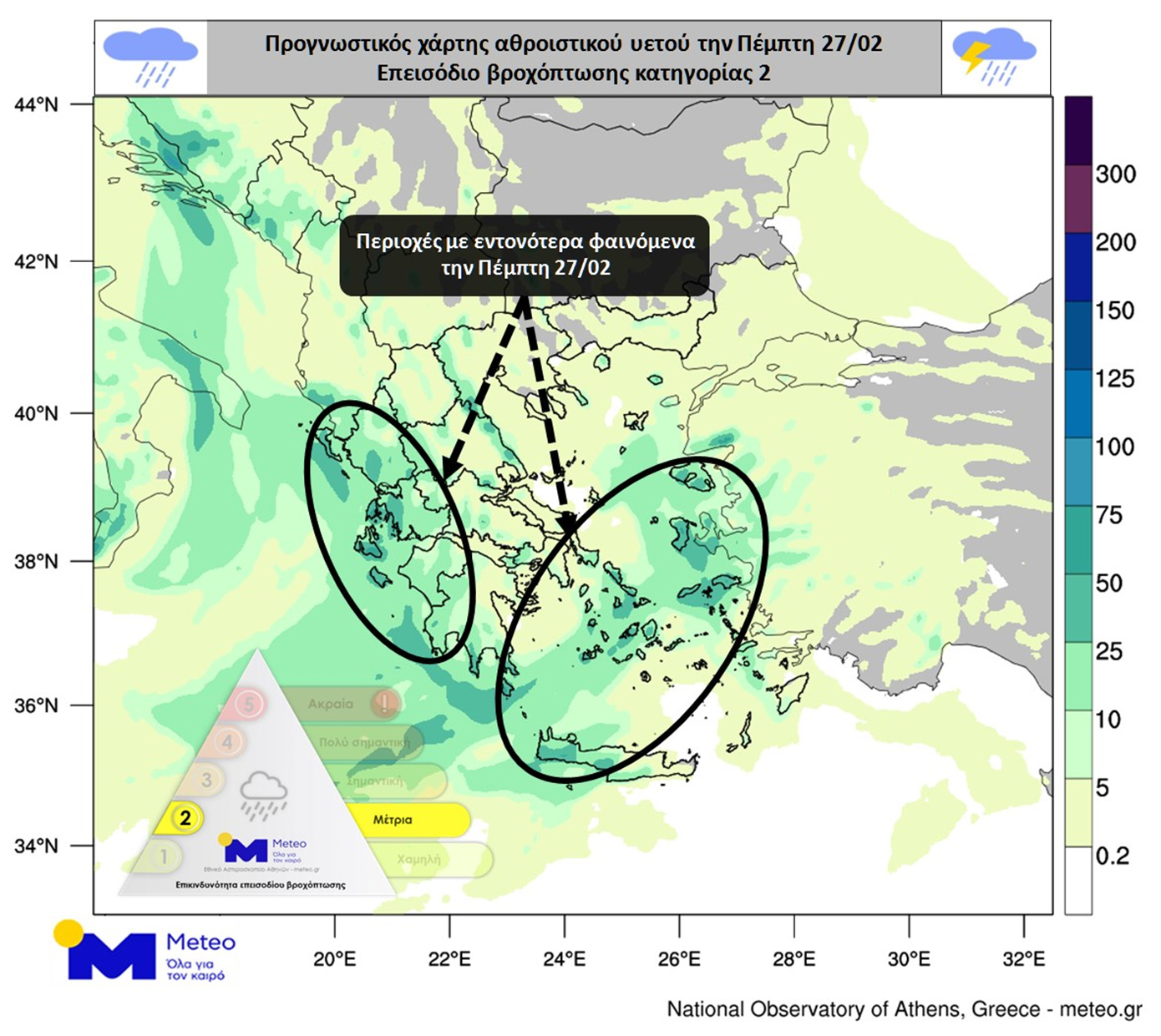 Την Πέμπτη 27/02, στο μεγαλύτερο μέρος της χώρας αναμένονται αυξημένες νεφώσεις με βροχές και καταιγίδες, κατά τόπους ισχυρές. Εντονότερα θα είναι τα φαινόμενα στα Επτάνησα, στη Δυτική Στερεά, στη Δυτική και Νότια Πελοπόννησο, σε περιοχές της Στερεάς, στα νησιά του Ανατολικού Αιγαίου, στις Κυκλάδες, στην Κρήτη και το βράδυ στα Δωδεκάνησα. Αυξημένη είναι η πιθανότητα χαλαζοπτώσεων σε τμήματα του Αιγαίου και της Κρήτης. Λίγα χιόνια θα πέσουν στα μεγαλύτερα υψόμετρα των ορεινών της ηπειρωτικής χώρας. Το επεισόδιο βροχόπτωσης κατατάσσεται στην Κατηγορία 2 (Μέτρια).