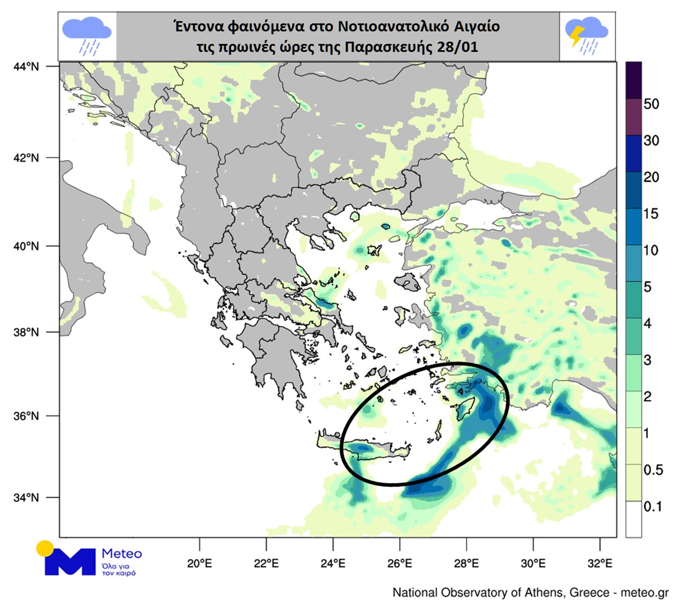 Μετά το μεσημέρι κατά τόπους ισχυρές βροχές και καταιγίδες προβλέπονται στα νησιά του Ανατολικού Αιγαίου και την Κρήτη (κυρίως τη δυτική και νότια), ενώ από το βράδυ θα επηρεαστούν με έντονα φαινόμενα και τα Δωδεκάνησα. Ύφεση των ισχυρών φαινομένων στις ανωτέρω περιοχές αναμένεται το πρωί της Παρασκευής (28-2-2025).