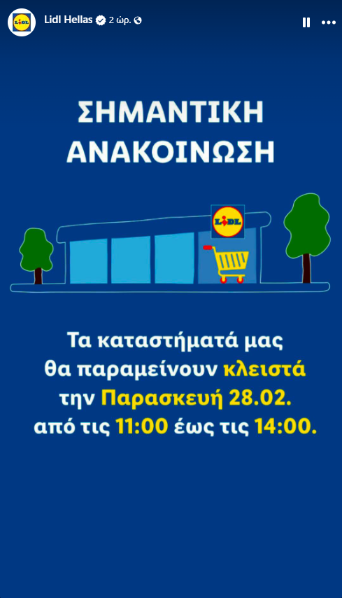 Όλα τα καταστήματα Lidl, My market, Κρητικός, Γαλαξίας και «Δ. Θανόπουλος» θα παραμείνουν κλειστά 11:00-14:00.