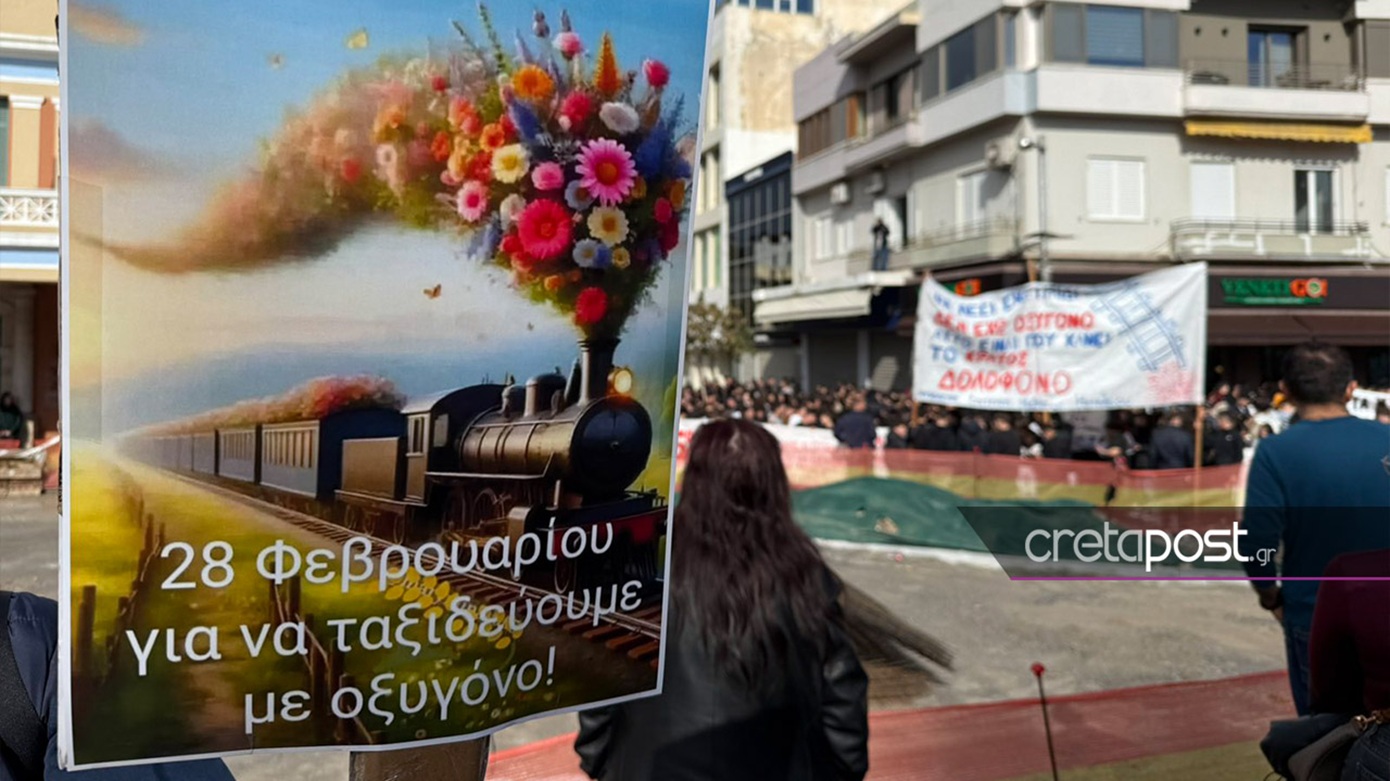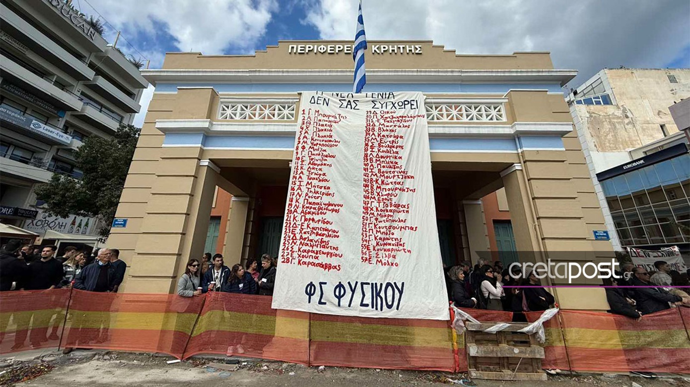 Μάλιστα, πανό με τα ονόματα των 57 νεκρών, κυρίως νέων ανθρώπων, που έχασαν τη ζωή τους στο τραγικό δυστύχημα αναρτήθηκε στο κτίριο της Περιφέρειας Κρήτης, στην πλατεία Ελευθερίας.