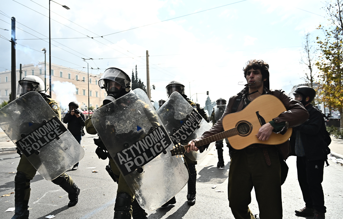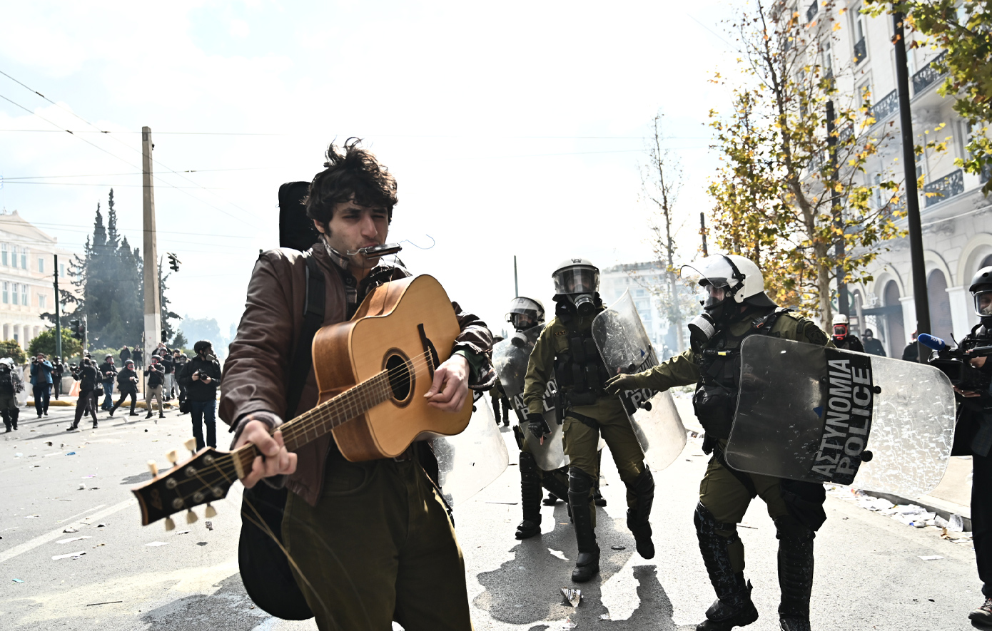 Φωτογραφίες που δημοσίευσε το πρακτορείο EUROKINISSI δείχνουν τον νεαρό να παίζει μουσική δίπλα στους άνδρες των ΜΑΤ, τη στιγμή που εκείνοι ξεχύνονται στον δρόμο και ο κόσμος απομακρύνεται.