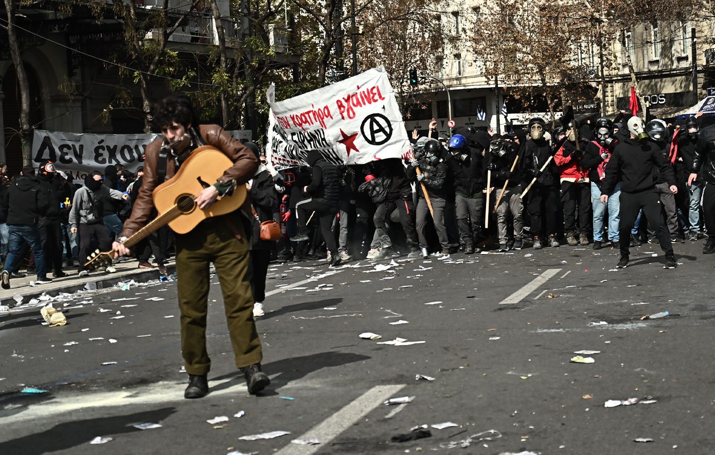 Ένα ασυνήθιστο περιστατικό διαδραματίστηκε κατά τη διάρκεια των επεισοδίων στο Σύνταγμα, καθώς ένας από τους διαδηλωτές για την τραγωδία των Τεμπών ξεκίνησε να παίζει κιθάρα και μάλιστα δίπλα στα ΜΑΤ.