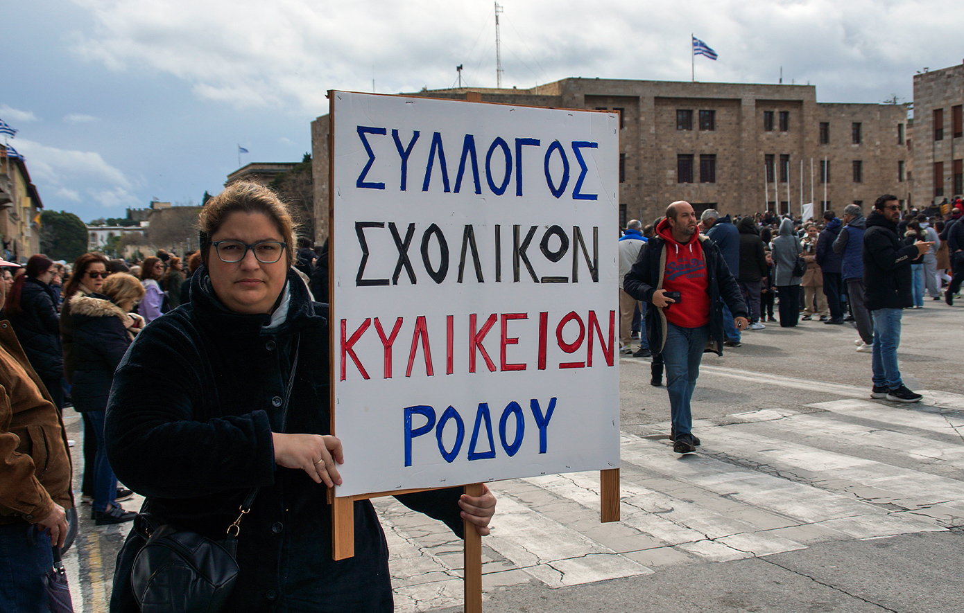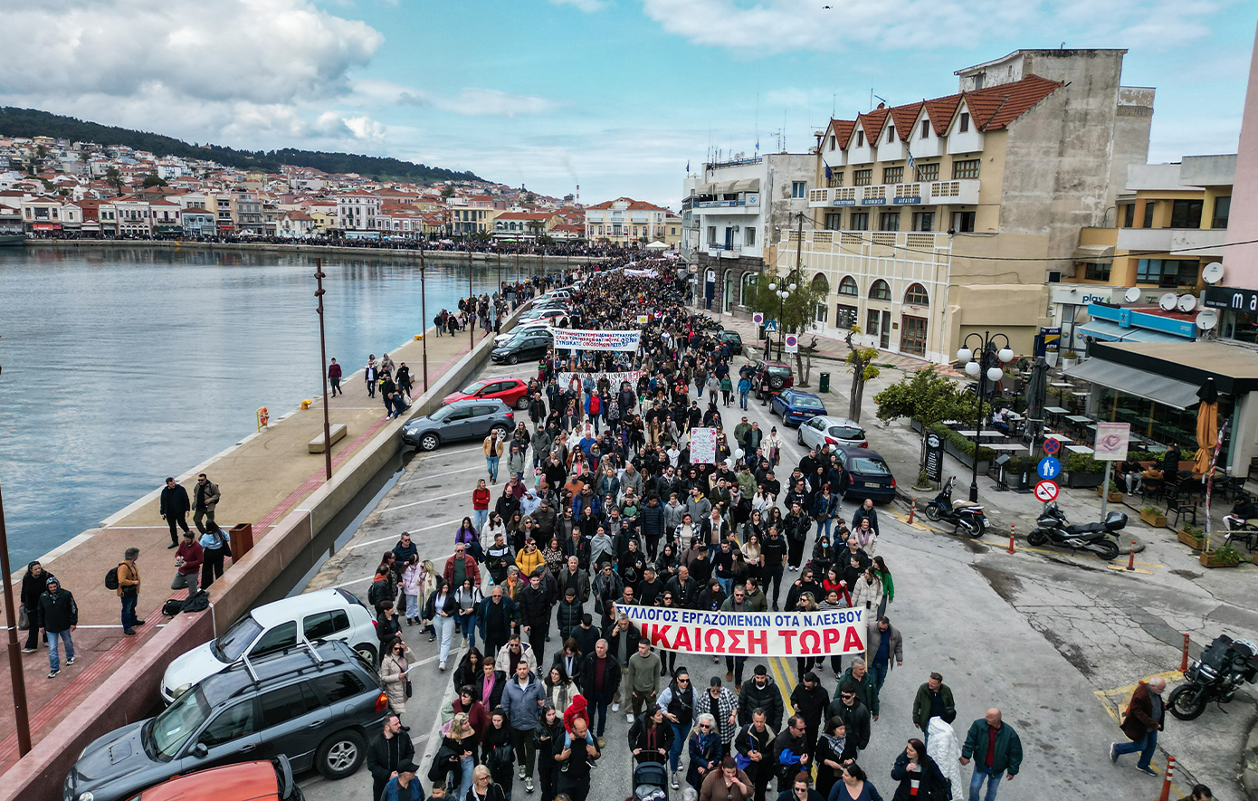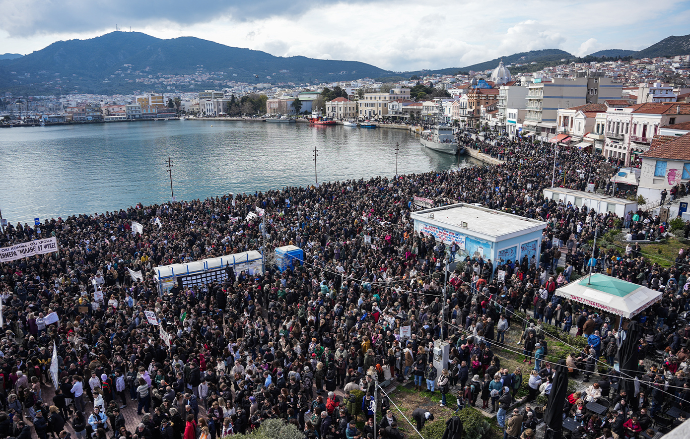 Κοσμοσυρροή στη Πλατεία Σαπφούς στη Μυτιλήνη, σε μια πρωτόγνωρη συγκέντρωση διαμαρτυρίας για τα δύο χρόνια από την τραγωδία των Τεμπών. Πολύς κόσμος είχε συγκεντρωθεί από το πρωί στην προκυμαία Μυτιλήνης διαδηλώνοντας για τα θύματα των Τεμπών.