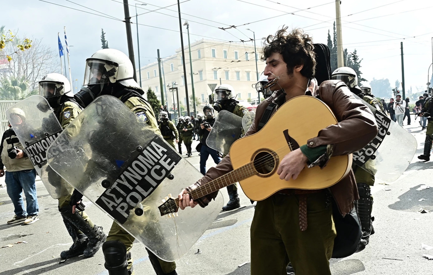 Ένας διαδηλωτής που ξεκίνησε να παίζει κιθάρα δίπλα στα ΜΑΤ, απτόητος, δημιουργώντας μια εικόνα σουρεαλιστική, σχεδόν ποιητική μέσα στο χάος.
