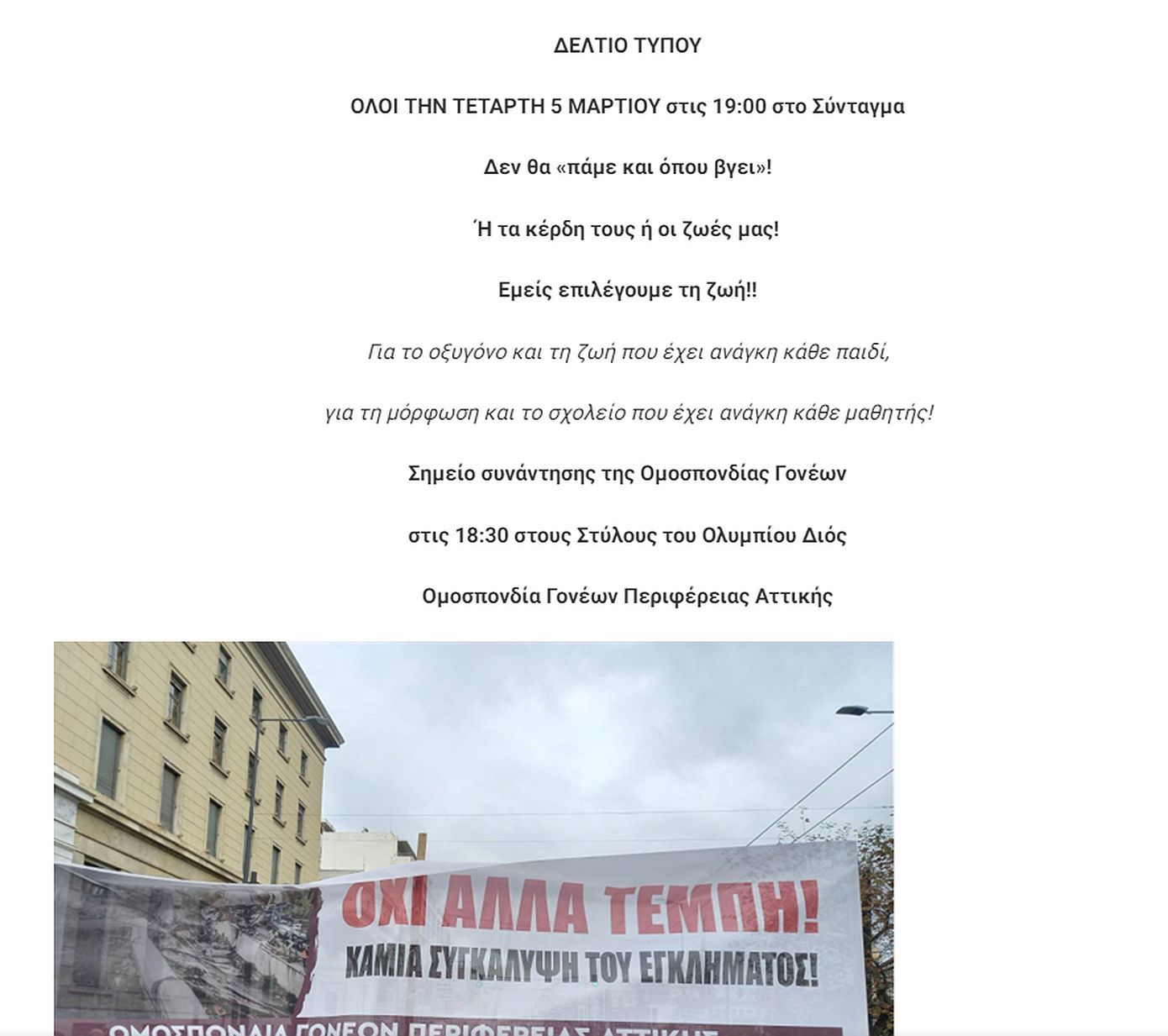 Σε μαζική συμμετοχή καλεί και η Ομοσπονδία Γονέων Αττικής. Σημείο συνάντησης της Ομοσπονδίας Γονέων είναι στις 18:30 στους Στύλους του Ολυμπίου Διός, την Τετάρτη 5 Μαρτίου.
