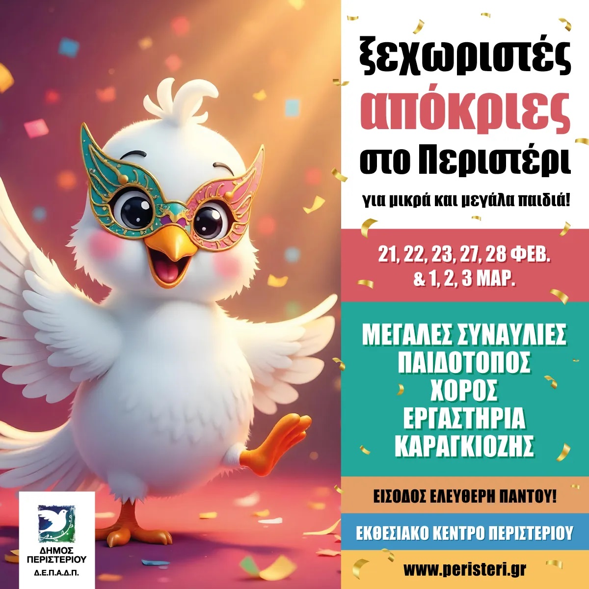 Δήμος Περιστερίου στο Εκθεσιακό Κέντρο (από 11 π.μ.) με παραδοσιακή συναυλία από τη Γωγώ Τσαμπά, με θεατρική διαδραστική παράσταση, με κουκλοθέατρο και Καραγκιόζη από το Θέατρο Σκιών του Κώστα Σπυρόπουλου και με την Συντεχνία Αρτοποιών Αθηνών, Προαστίων & Περιχώρων να παρασκευάζει τη μεγαλύτερη λαγάνα.