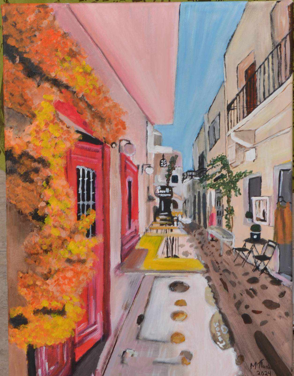 Μ: Εγώ στους πίνακες μου απεικονίζω τοπία ή σκηνές από την καθημερινότητα, με μια ρεαλιστική αναπαράσταση, με φανταχτερά χρώματα για να θυμίσω στους ανθρώπους την ομορφιά που υπάρχει γύρω μας και τη χάνουμε μέσα στους γρήγορους ρυθμούς μας και τις φοβίες μας, είτε πρόκειται για τη φύση, είτε πρόκειται για ανθρώπινες σχέσεις (π.χ. οι ανθρώπινες αγκαλιές, ένα πουλί που απολαμβάνει το νερό της βροχής).