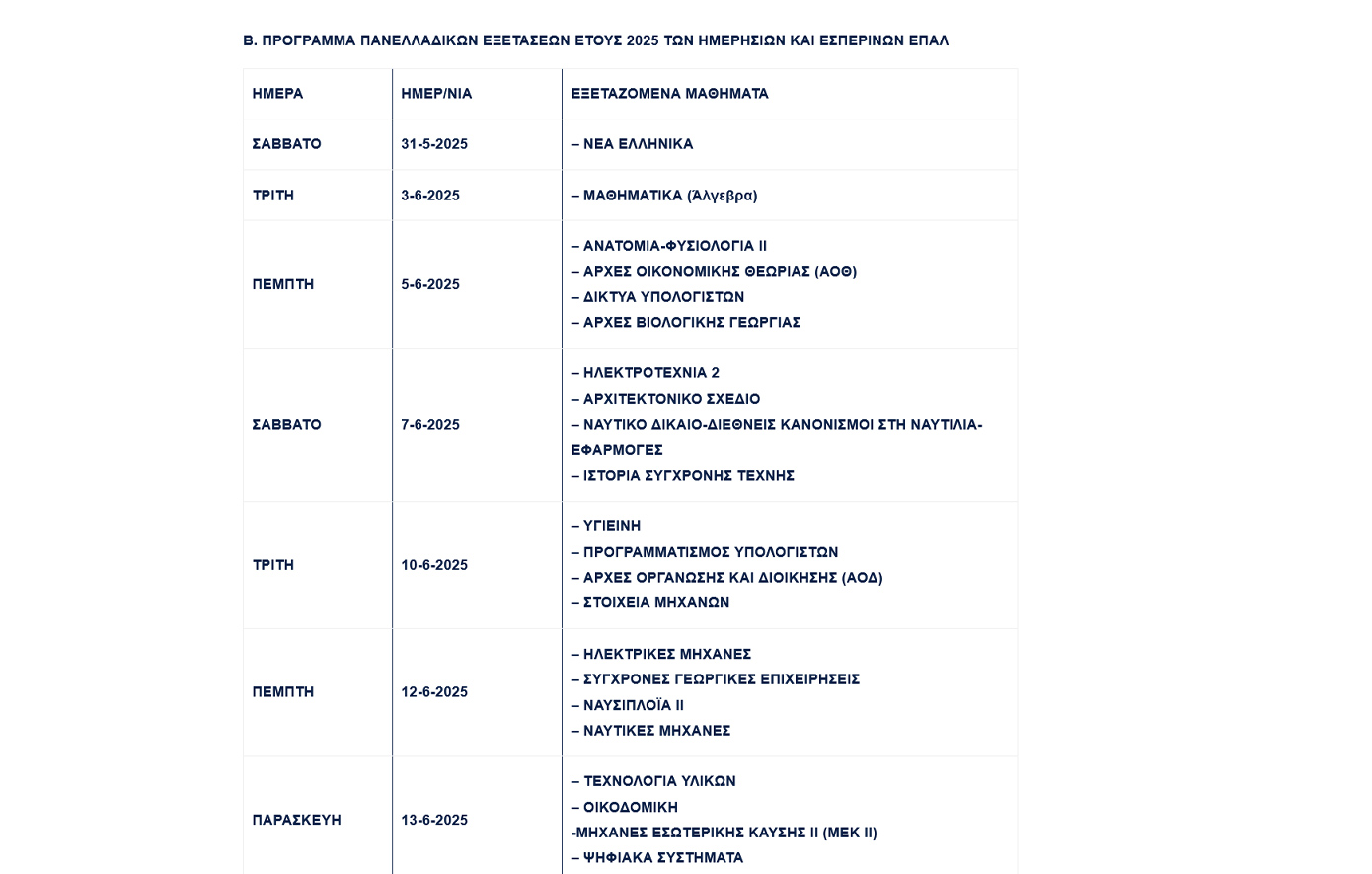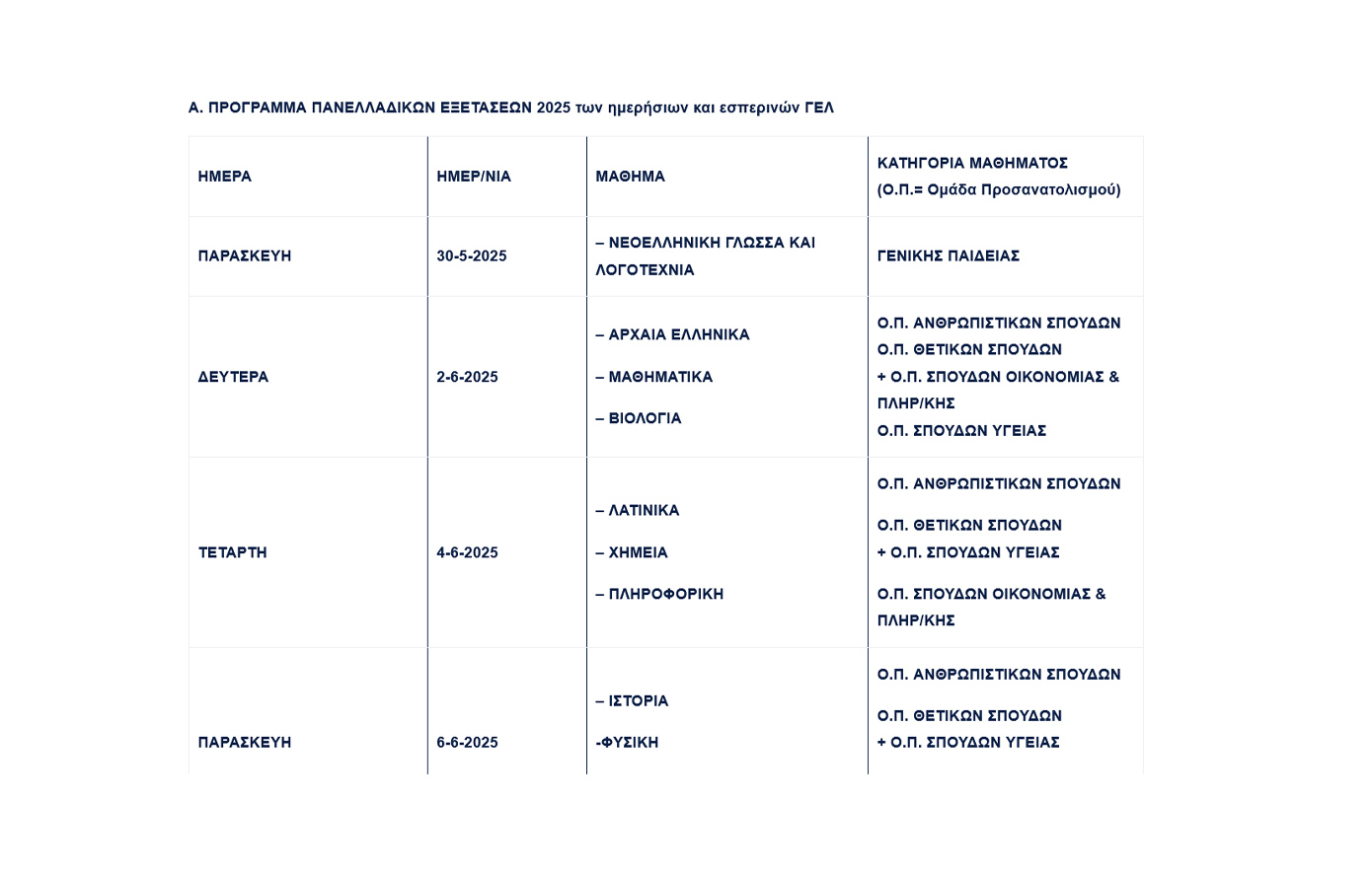 Το πλήρες πρόγραμμα των Πανελληνίων Εξετάσεων για το 2025 ανακοίνωσε το υπουργείο Παιδείας, Θρησκευμάτων και Αθλητισμού.