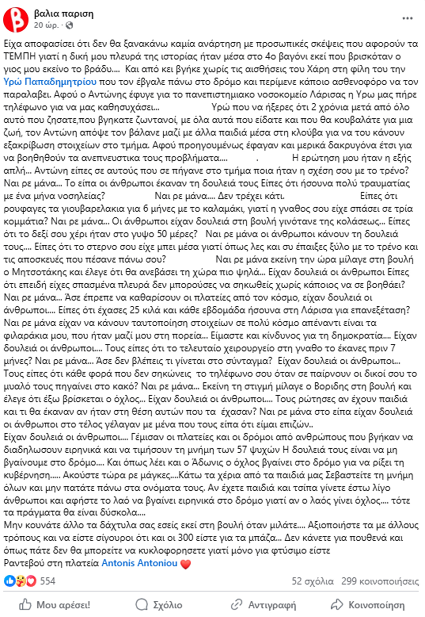 «Αποφάσισα να δοκιμάσω τα όρια της υπομονής μου και να τους εξηγήσω γιατί έχω αναπνευστικά προβλήματα και για ποιο λόγο πανικοβλήθηκα και έχασα τις αναπνοές μου. Η πρώτη αναφορά στα Τέμπη δεν έφερε καμιά αντίδραση, η δεύτερη αναφορά πάνω στην εξακρίβωση στοιχείων, ρώτησα τον αστυνομικό μήπως θα ήθελε και τη θέση μου στο τρένο εκείνο το βράδυ. Πήρα ένα πολύ ωραίο χαμόγελο. Μάλλον είχε πλάκα αυτό που είπα», λέει στο βίντεό του.