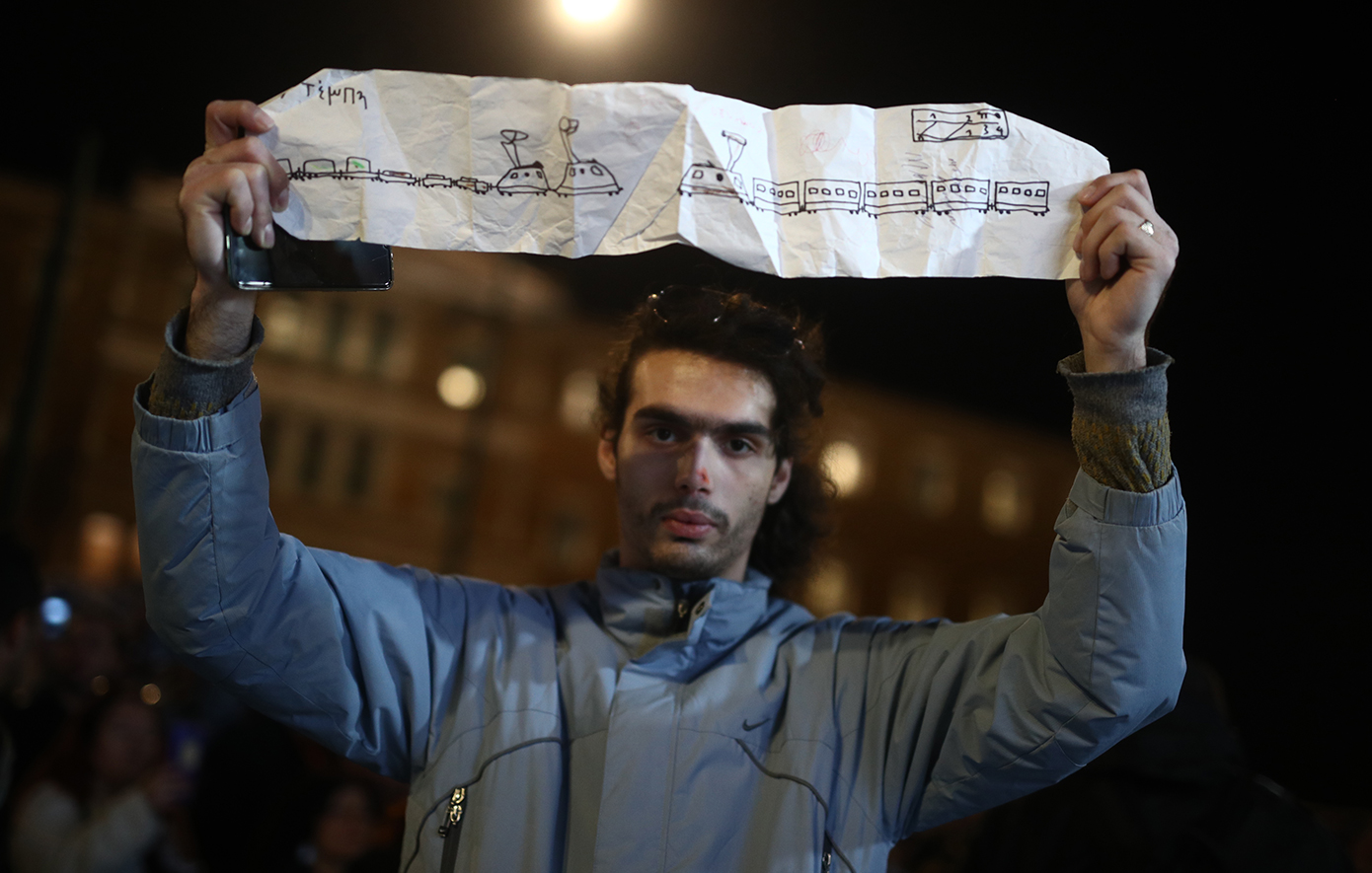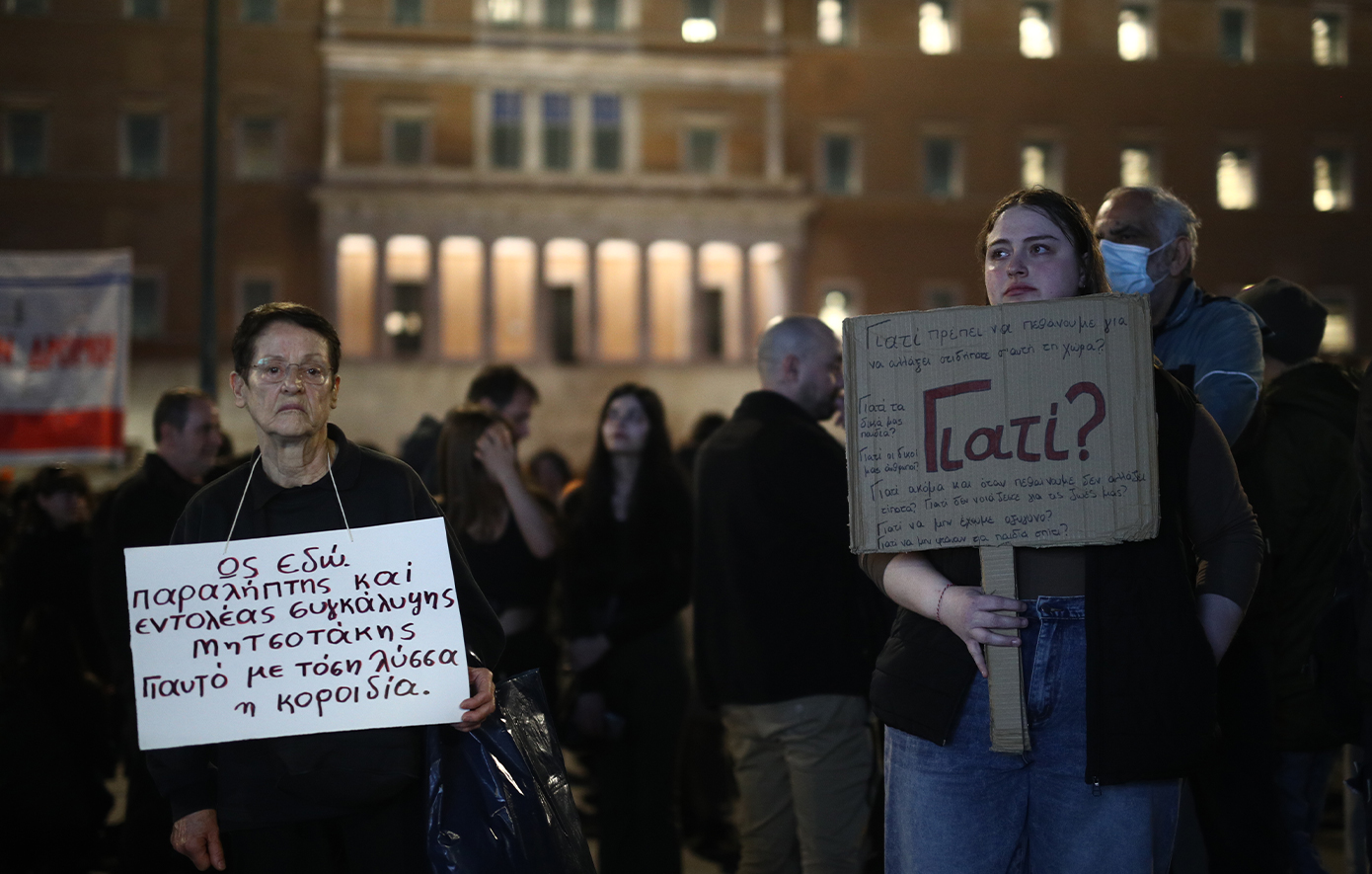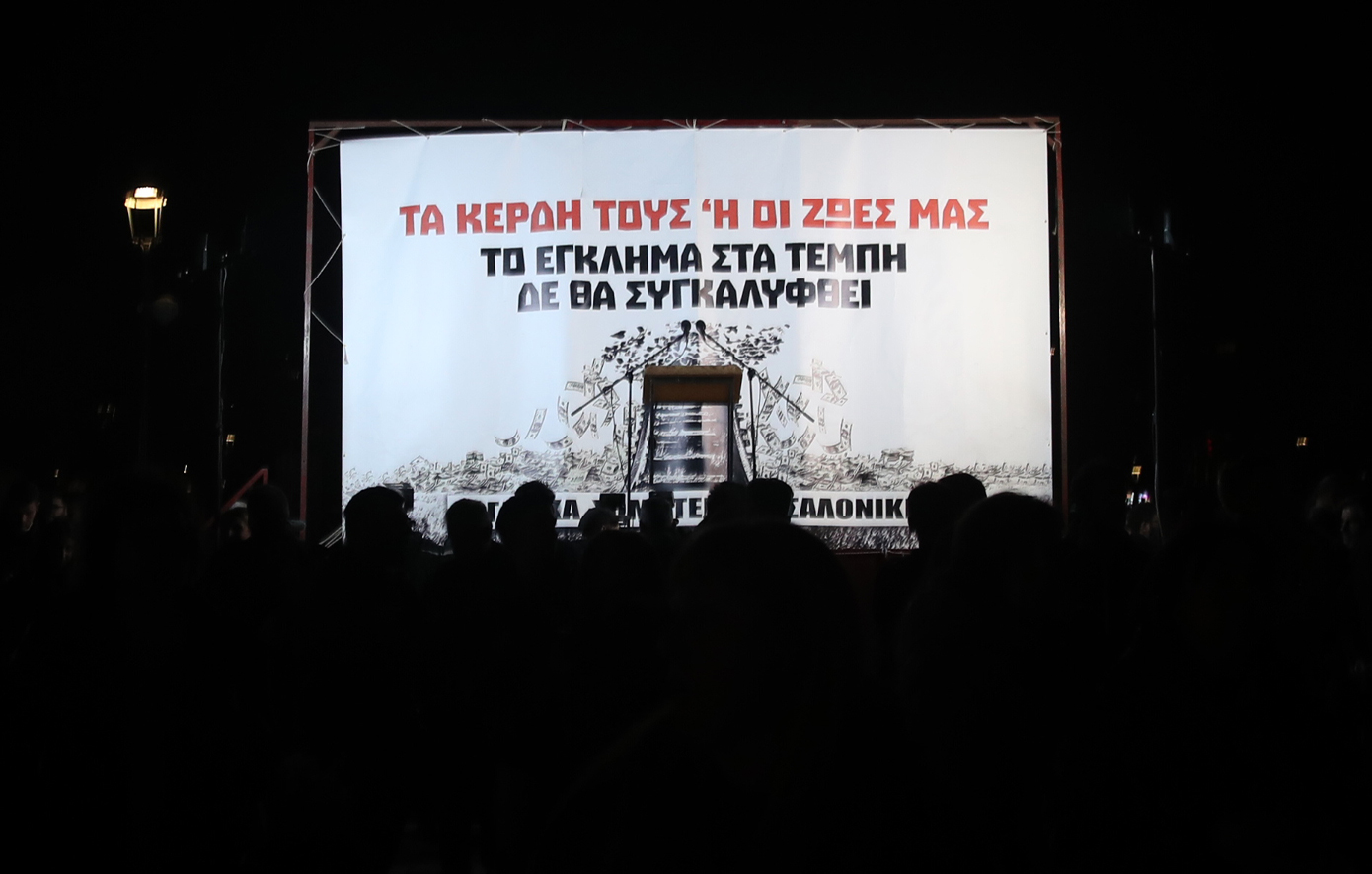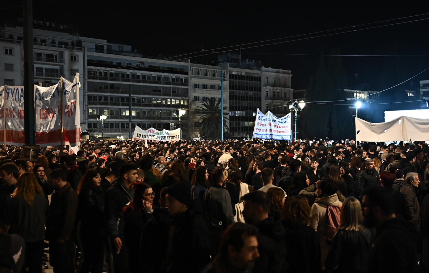 Την ώρα που στη Βουλή συνεχίζεται η συζήτηση ενόψει της ψηφοφορίας επί της πρότασης δυσπιστίας, οι συμμετέχοντες στη συγκέντρωση άρχισαν από νωρίς να συγκεντρώνονται γύρω από την κεντρική εξέδρα της εκδήλωσης και έξω από το Κοινοβούλιο, γύρω από το αυτοσχέδιο «ηρώο» με τα ονόματα των 57 νεκρών, που ήταν στεφανωμένο με ανθοδέσμες