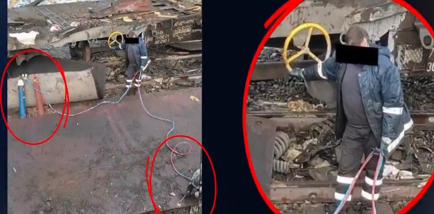 Στη φωτογραφία φαίνονται εργάτες να κόβουν με οξυγόνο τμήμα της πλατφόρμας της εμπορικής αμαξοστοιχίας προκειμένου να στοιβαχτεί κομμάτι κομμάτι σε φορτηγό και να μεταφερθεί στο Κουλούρι.