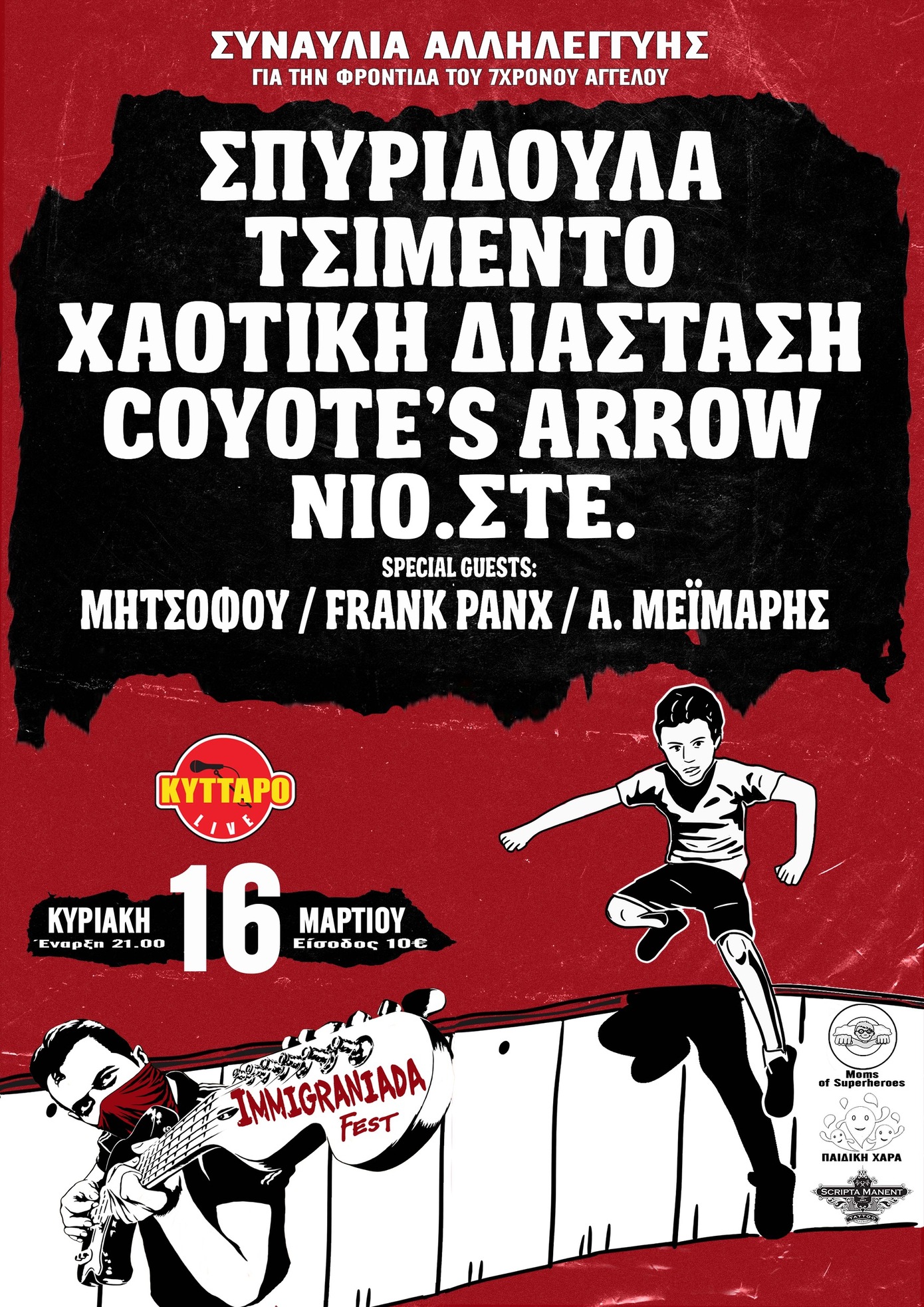 Την σκηνή του Κύτταρο live θα μοιραστούν οι Σπυριδούλα, Τσιμέντο, Νιο.Στε, Χαοτική Διάσταση, Coyote’s Arrow και οι Μητσοφού / Αντώνης Μεϊμάρης (Κοινοί Θνητοί) σε μια σύμπραξη με τον Frank Panx.