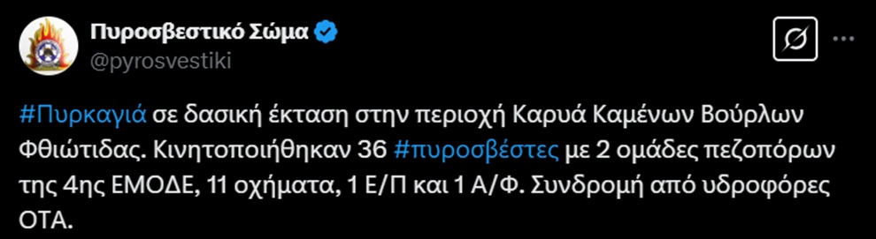 Φωτιά ξέσπασε το απόγευμα της Τρίτης (11/3) στην περιοχή Καρυά Καμένων Βούρλων Φθιώτιδας.