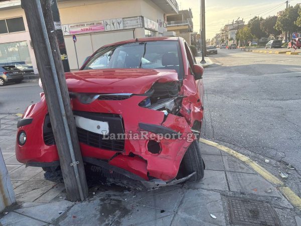 Μετά τη σφοδρή σύγκρουση, το κόκκινο Ι.Χ. προσέκρουσε σε κολόνα της ΔΕΗ, με αποτέλεσμα η οδηγός του να εγκλωβιστεί στο όχημα.