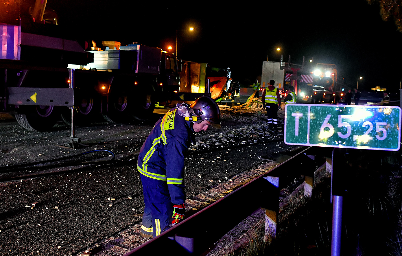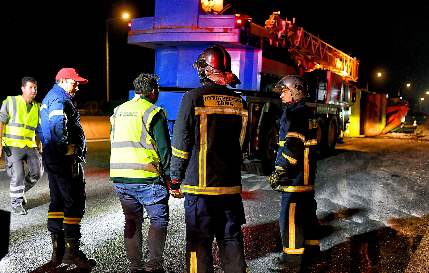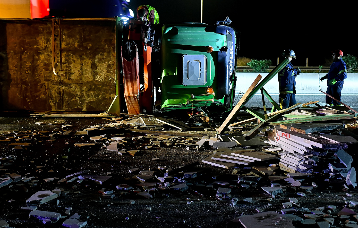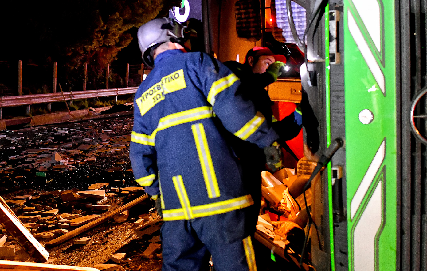 Λόγω της ανατροπής του φορτηγού, διεκόπη η κυκλοφορία των οχημάτων και γίνεται εκτροπή της από τον κόμβο των Αγίων Θεοδώρων.