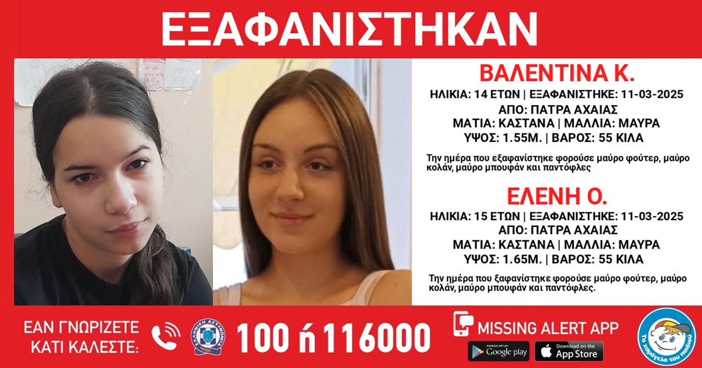 Το «Χαμόγελο του Παιδιού» δημοσιοποίησε αργά το βράδυ τα στοιχεία και τις φωτογραφίες από τις δύο ανήλικες που εξαφανίστηκαν την Πέμπτη από το Κέντρο Παιδικής Μέριμνας Θηλέων, στην Ακτή Δυμαίων της Πάτρας κατόπιν εισαγγελικής εντολής.