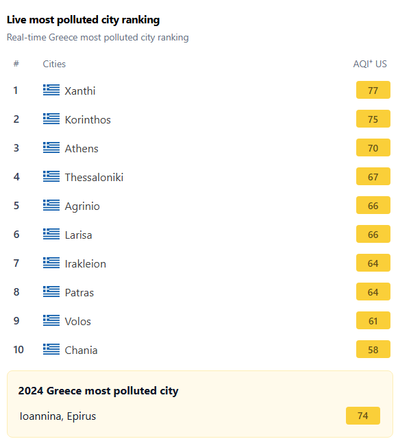 Σύμφωνα με την έκθεση της ελβετικής εταιρείας IQAir, η οποία παρακολουθεί την παγκόσμια ποιότητα του αέρα, οι πέντε πιο μολυσμένες περιοχές στη χώρα μας για το 2024 είναι:
