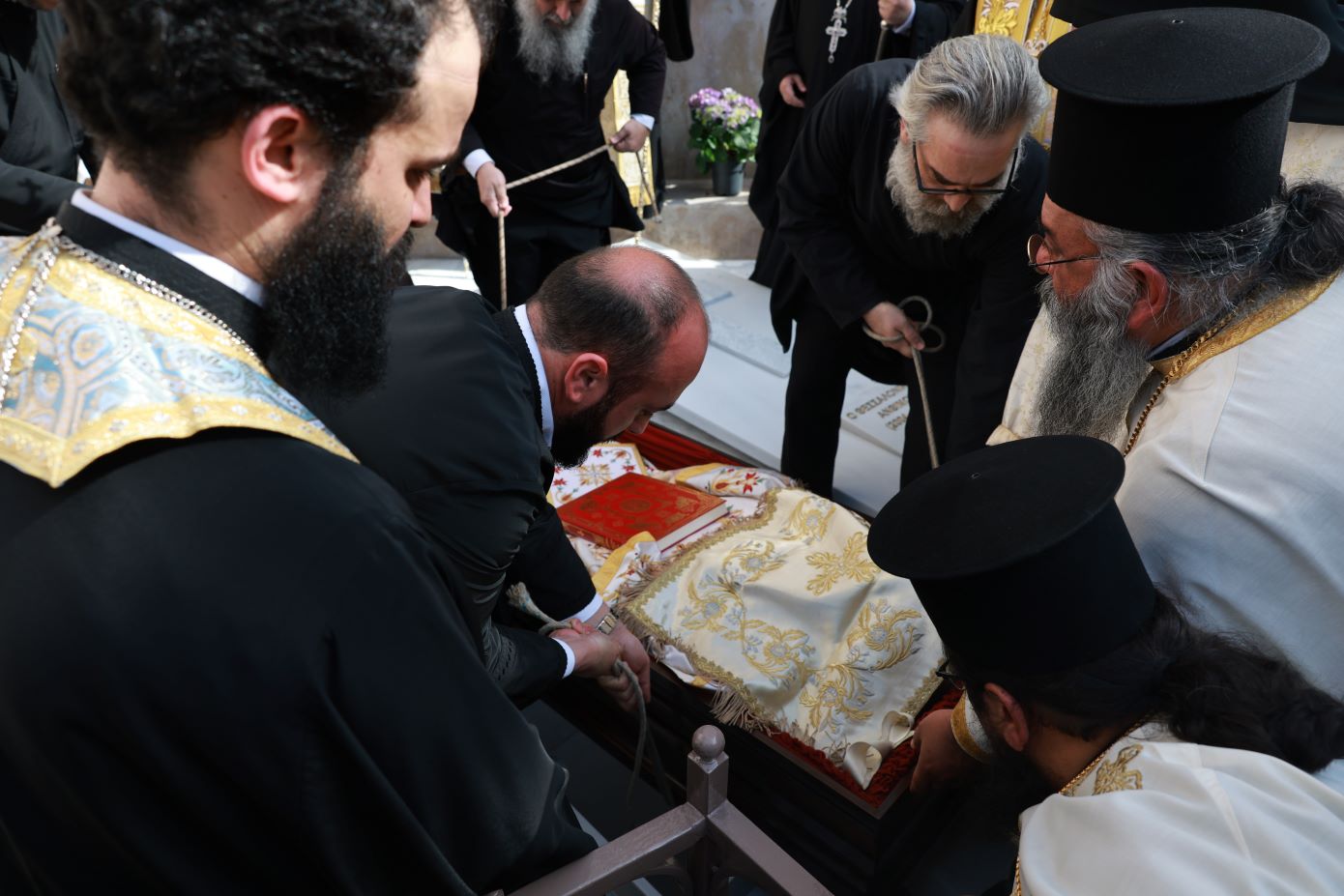 Με χώμα από την ιδιαίτερη πατρίδα του, την Ηλεία, που έφεραν συγγενείς του, ετάφη το μεσημέρι ο ιεράρχης, μετά από προσωπική του επιθυμία, στο κενοτάφιο του μακαριστού μητροπολίτη Θεσσαλονίκης Γενναδίου.
