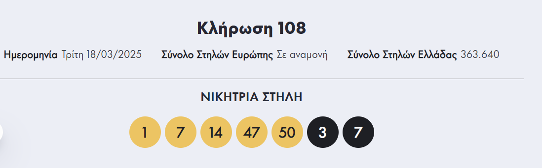 Οι τυχεροί αριθμοί είναι οι εξής: 1, 7, 14, 47, 50 και 3,7.
