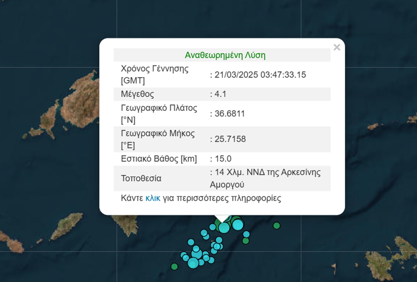Το επίκεντρο της σεισμικής δόνησης εντοπίστηκε 14 χιλιόμετρα νοτιοδυτικά της Αρκεσίνης Αμοργού με εστιακό βάθος 15 χλμ.