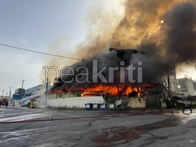 Ισχυρές δυνάμεις της Πυροσβεστικής παραμένουν στη Βιομηχανική Περιοχή του Ηρακλείου για την κατάσβεση πυρκαγιάς στο εργοστάσιο ξυλείας.