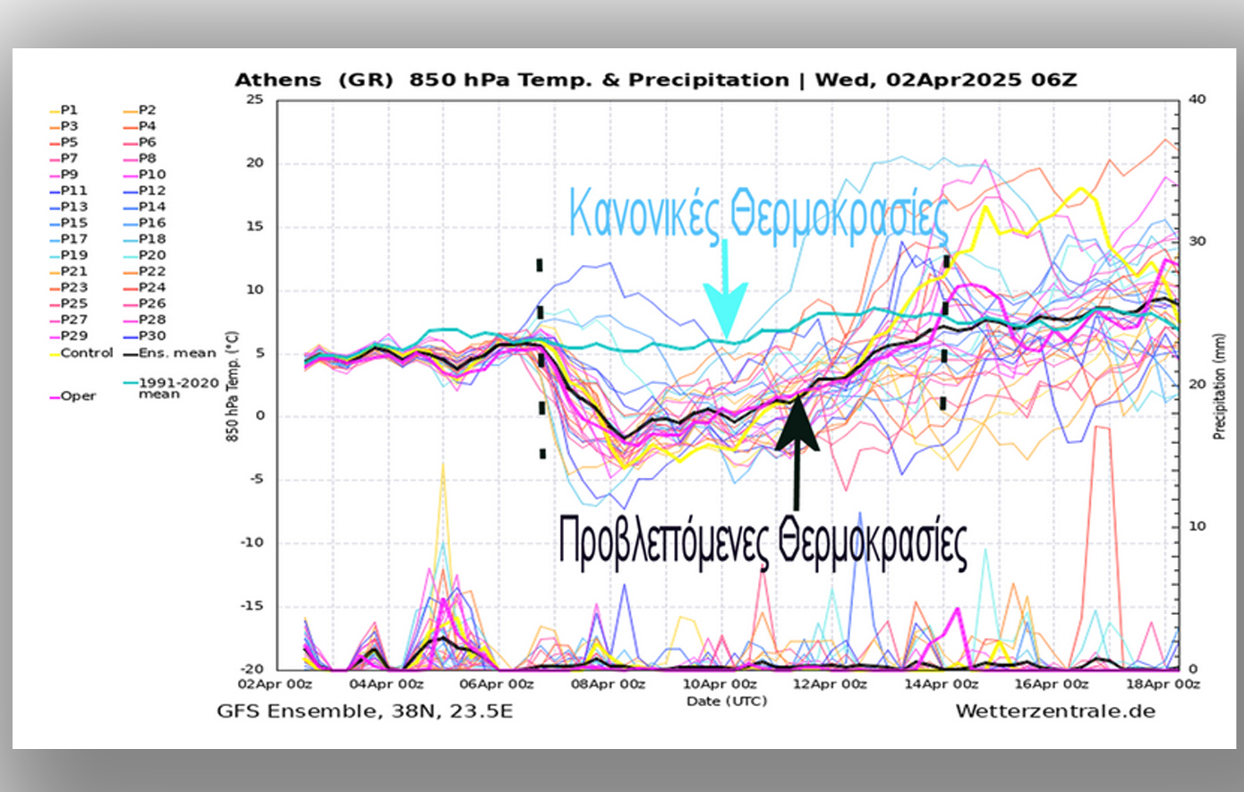 «Τα προγνωστικά στοιχεία που παραθέτουμε δεν φτάνουν μέχρι το τέλος της ερχόμενης εβδομάδος. Εκείνο που μπορούμε να σημειώσουμε παρατηρώντας το παραπάνω μετεώγραμμα είναι οτι η θερμοκρασία αρχίζει να επανέρχεται σε κανονικές τιμές μετά του Λαζάρου.