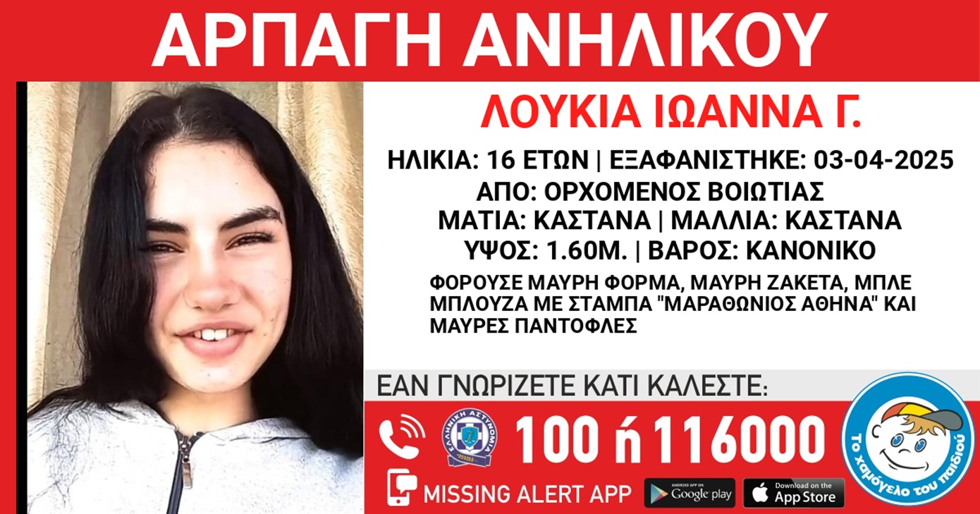 Εξαφανίστηκε ανήλικη από την περιοχή του Ορχομενού Βοιωτίας την Πέμπτη 03/04 με το «Χαμόγελο του Παιδιού» να εκδίδει missing alert αναφέροντας αρπαγή.