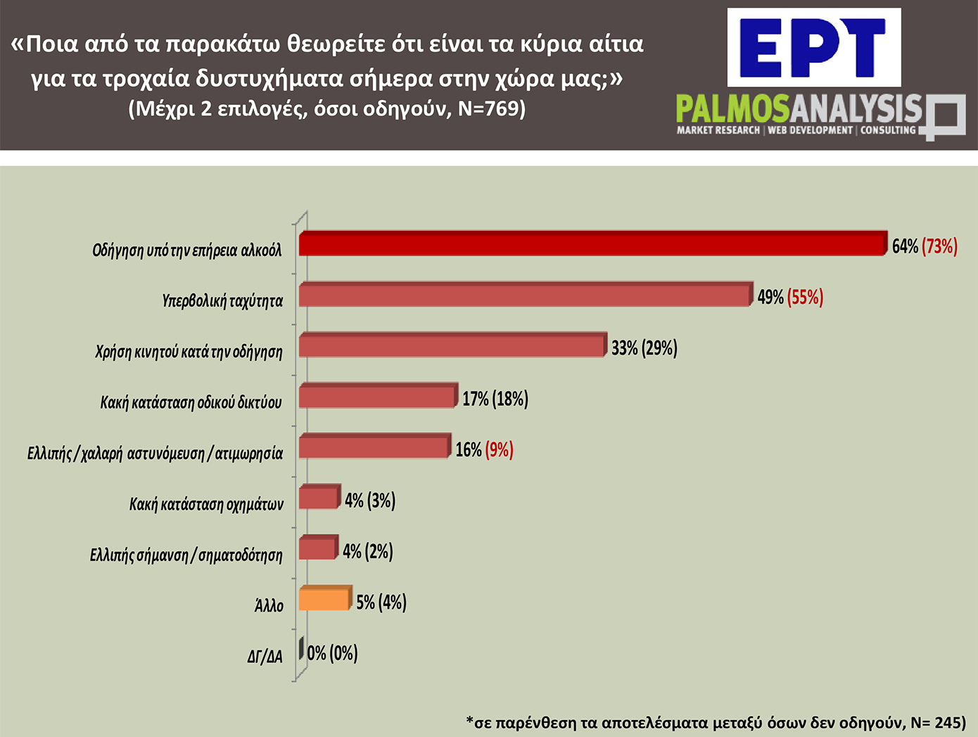 Σύμφωνα με τους ερωτηθέντες, η οδήγηση υπό την επήρεια αλκοόλ θεωρείται η βασική αιτία τροχαίων δυστυχημάτων στη χώρα (64% μεταξύ των οδηγών και 73% μεταξύ όσων δεν οδηγούν). Ακολουθούν η υπερβολική ταχύτητα (49% και 55% αντίστοιχα), η χρήση κινητού κατά την οδήγηση (33% και 29%), η κακή κατάσταση του οδικού δικτύου (17% και 18%), η ελλιπής αστυνόμευση και ατιμωρησία (16% και 9%), η κακή κατάσταση των οχημάτων (4% και 3%) και η ελλιπής σήμανση (4% και 2%).