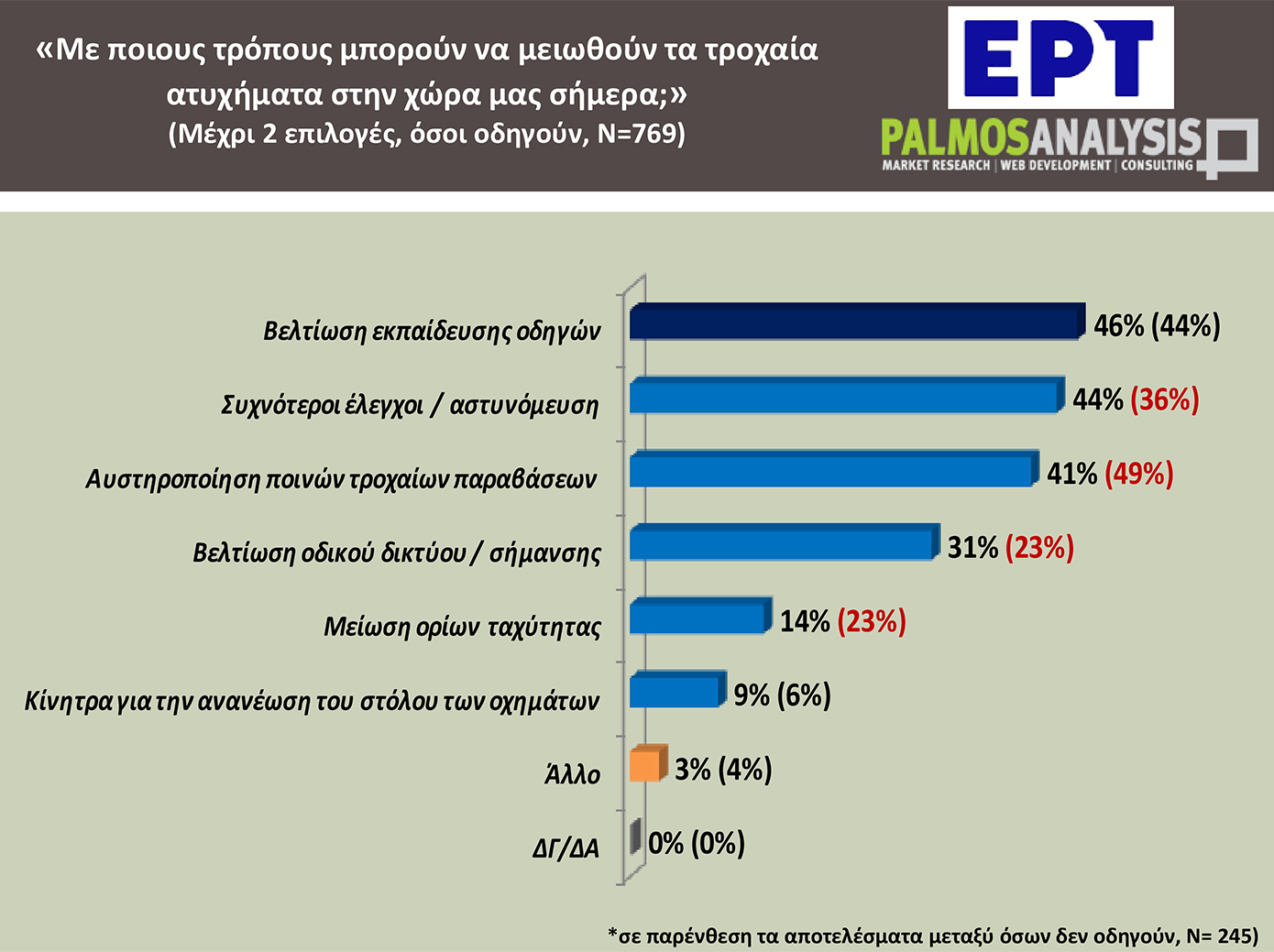 Όσον αφορά τα μέτρα πρόληψης, οι οδηγοί θεωρούν πως η βελτίωση της εκπαίδευσης των οδηγών είναι η πιο ενδεδειγμένη λύση για τη μείωση των τροχαίων ατυχημάτων (46%). Αντίθετα, όσοι δεν οδηγούν θεωρούν πιο αποτελεσματική την αυστηροποίηση των ποινών για τροχαίες παραβάσεις (49%). Άλλα μέτρα που προτείνονται περιλαμβάνουν συχνότερους ελέγχους και ενισχυμένη αστυνόμευση (44% μεταξύ των οδηγών, 36% μεταξύ όσων δεν οδηγούν), βελτίωση του οδικού δικτύου και της σήμανσης (31% και 23%), μείωση των ορίων ταχύτητας (14% και 23%) και παροχή κινήτρων για ανανέωση του στόλου οχημάτων (9% και 6%).