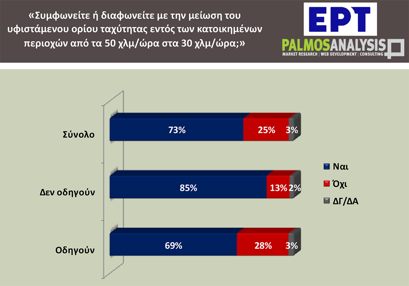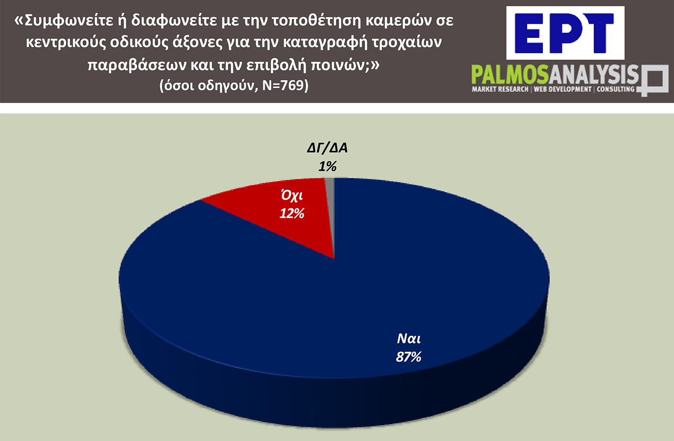 Η συντριπτική πλειοψηφία των πολιτών τάσσεται υπέρ της μείωσης των ορίων ταχύτητας εντός κατοικημένων περιοχών, καθώς και της εγκατάστασης καμερών στους κεντρικούς οδικούς άξονες για την καταγραφή τροχαίων παραβάσεων και την επιβολή προστίμων. Τα στοιχεία αυτά προκύπτουν από την πανελλαδική έρευνα της εταιρείας Palmos Analysis, η οποία παρουσιάστηκε στο ΕΡΤNEWS και πραγματοποιήθηκε το διάστημα 26-31 Μαρτίου 2025