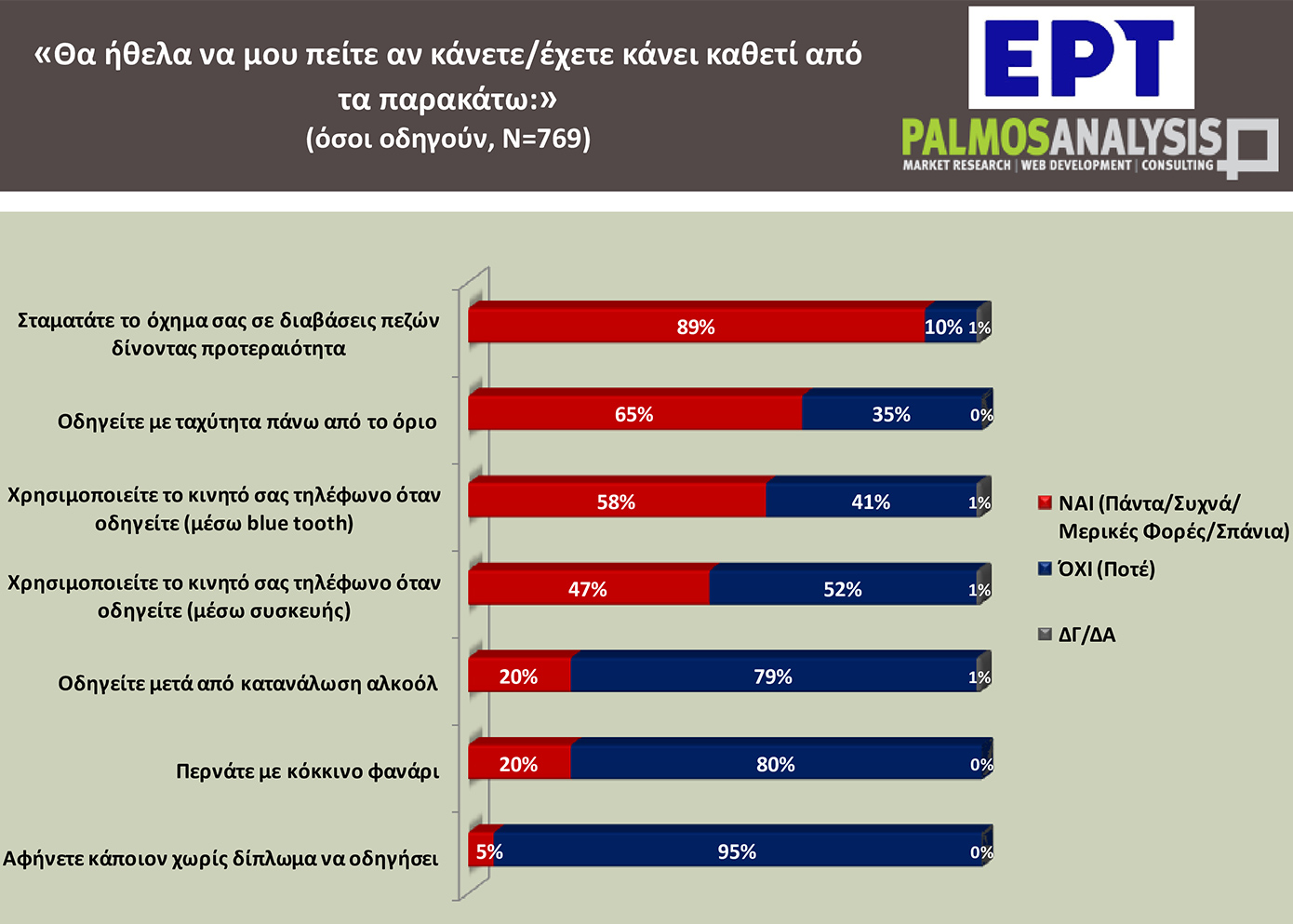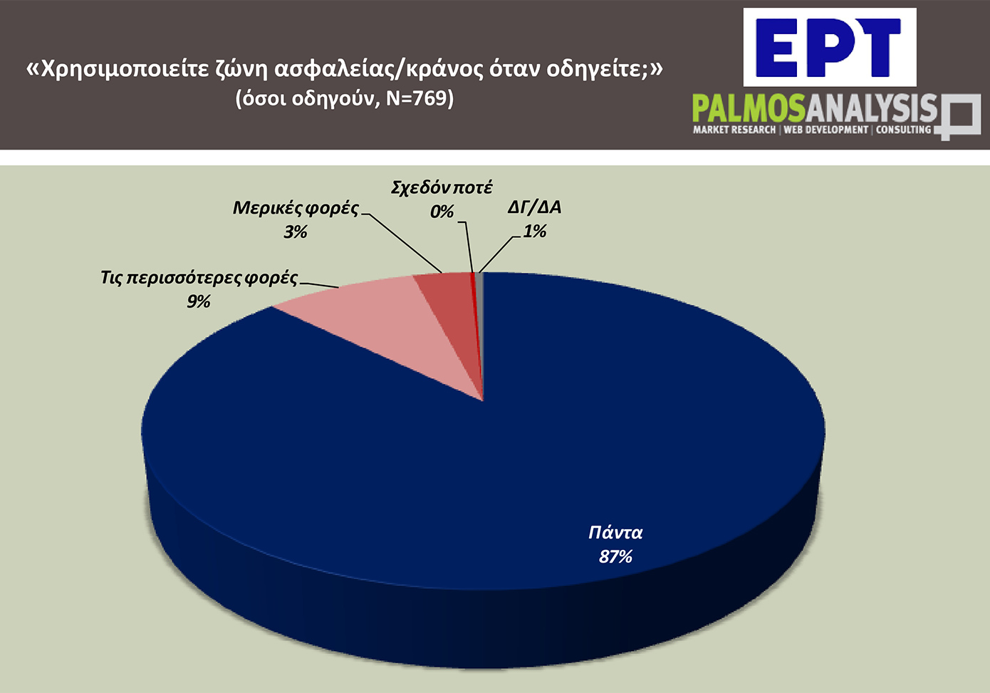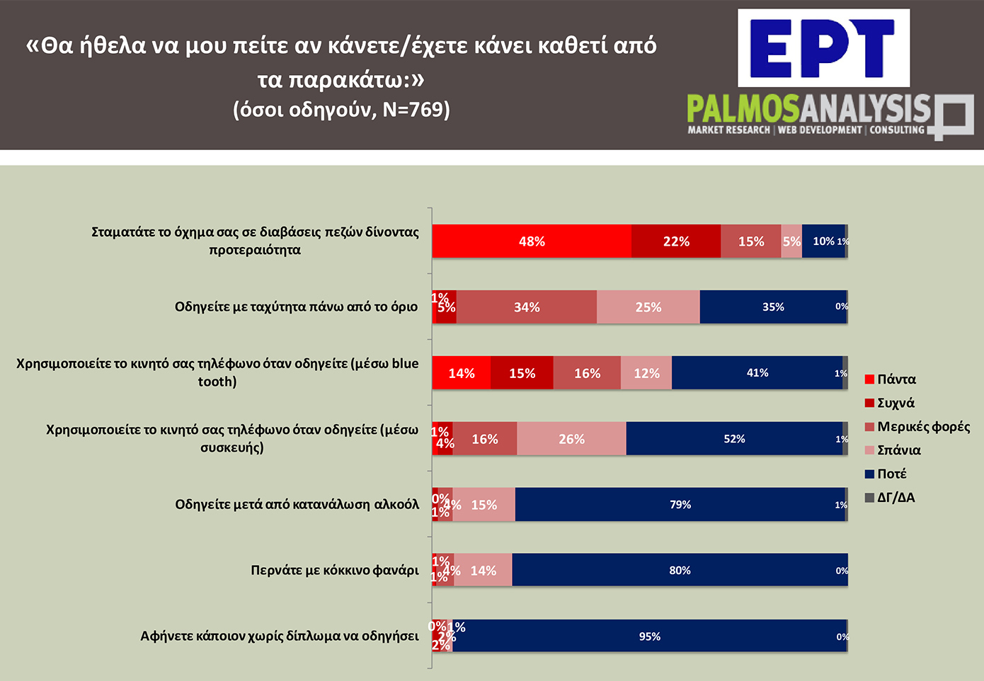 Το 87% των οδηγών δηλώνει ότι χρησιμοποιεί πάντα ζώνη ασφαλείας ή κράνος. Ωστόσο, μόνο το 48% σταματά πάντα σε διαβάσεις πεζών, ενώ το 10% δηλώνει ότι δεν το πράττει ποτέ.