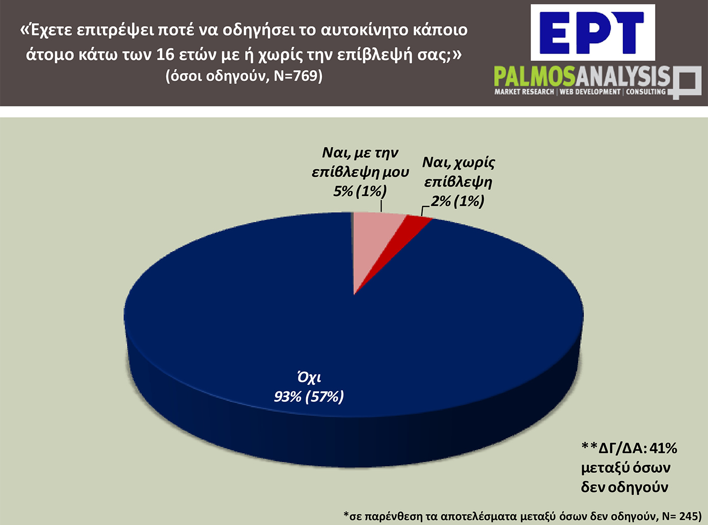 Επιπλέον, 5% των οδηγών αναφέρουν ότι επιτρέπουν σε άτομα χωρίς δίπλωμα να οδηγήσουν (2% συχνά, 2% μερικές φορές, 1% σπάνια), ενώ το 7% έχει επιτρέψει σε ανήλικο κάτω των 16 ετών να οδηγήσει όχημα, είτε με επίβλεψη (5%) είτε χωρίς (2%).