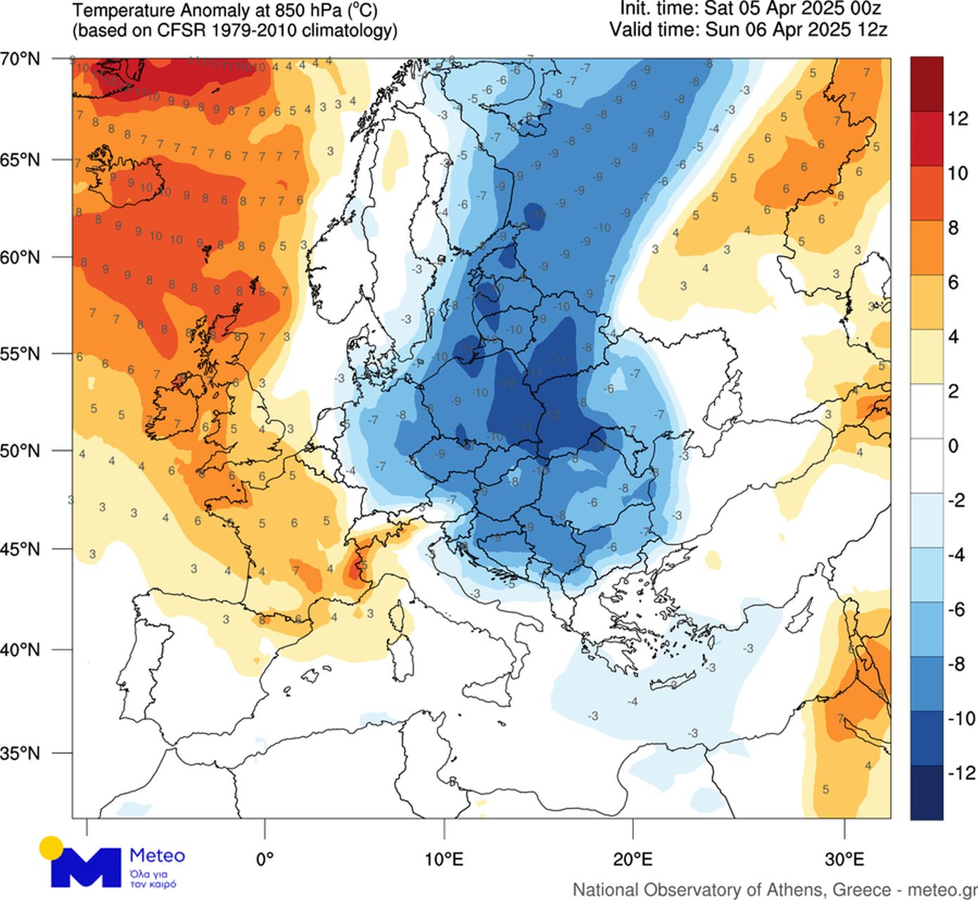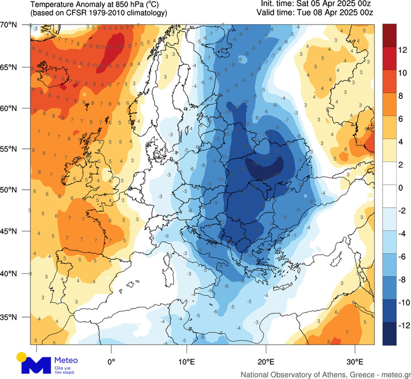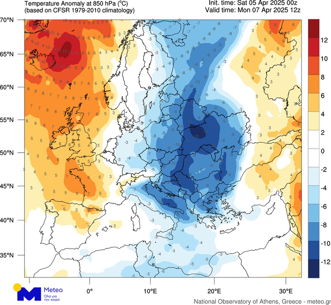 Στις εικόνες που ακολουθούν παρουσιάζεται η απόκλιση της θερμοκρασίας των αερίων μαζών σε ύψος 1500 μέτρων από τη μέση στάθμη της θάλασσας από την Κυριακή 06/04 έως την Τρίτη 08/04. Όπως διακρίνουμε, οι ψυχρές αέριες μάζες που θα επηρεάσουν τη χώρα θα είναι κατά τόπους έως και 10 με 12°C ψυχρότερες από τις κανονικές για την εποχή.