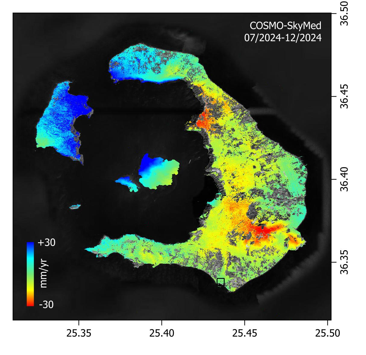 Ενδείξεις δραστηριότητας στο βόρειο τμήμα της καλντέρας της Σαντορίνης τον Ιούλιο του 2024 και εδαφική παραμόρφωση που εξελίχθηκε έως και τα τέλη του έτους δείχνουν τα πρώτα ευρήματα του ΑΠΘ, με τη χρήση δορυφορικών δεδομένων ραντάρ COSMO-SkyMed σε συνεργασία με την ASI.