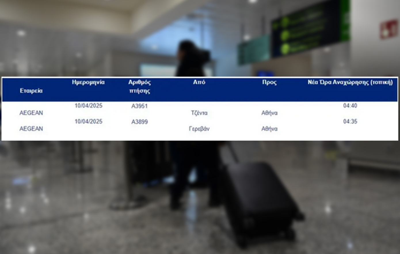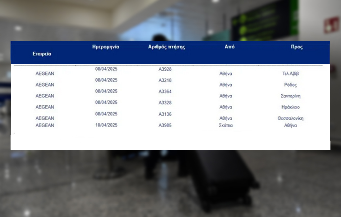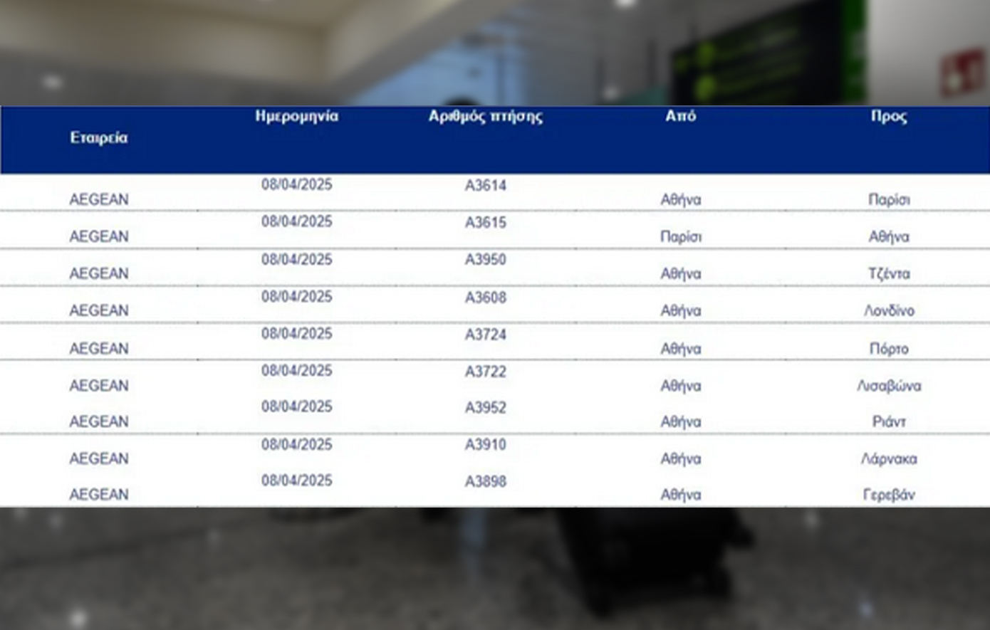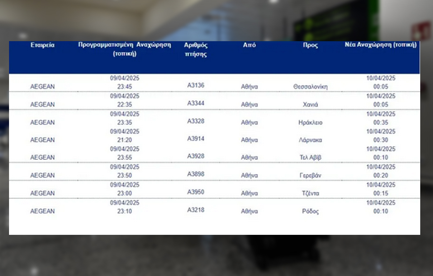 Συγκεκριμένα, την Τετάρτη 9 Απριλίου 2025 ακυρώνονται όλες οι προγραμματισμένες πτήσεις του δικτύου εσωτερικού και εξωτερικού, εκτός από τις παρακάτω, οι οποίες θα πραγματοποιηθούν με τις κάτωθι τροποποιήσεις: