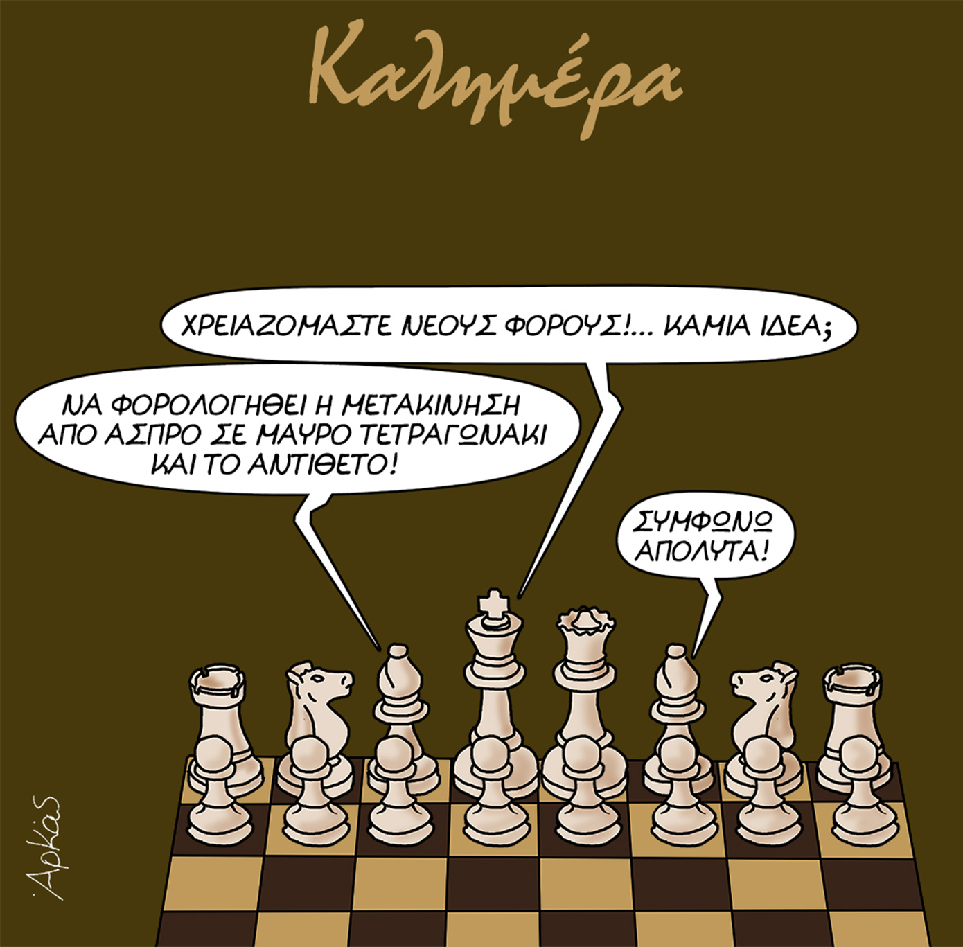 «Χρειαζόμαστε νέους φόρους!… Καμία ιδέα;». Η σημερινή καλημέρα του γνωστού σκιτσογράφου Αρκά προς τους διαδικτυακούς του φίλους αφορά μια φορολογική συζήτηση πάνω σε μια παρτίδα σκάκι.