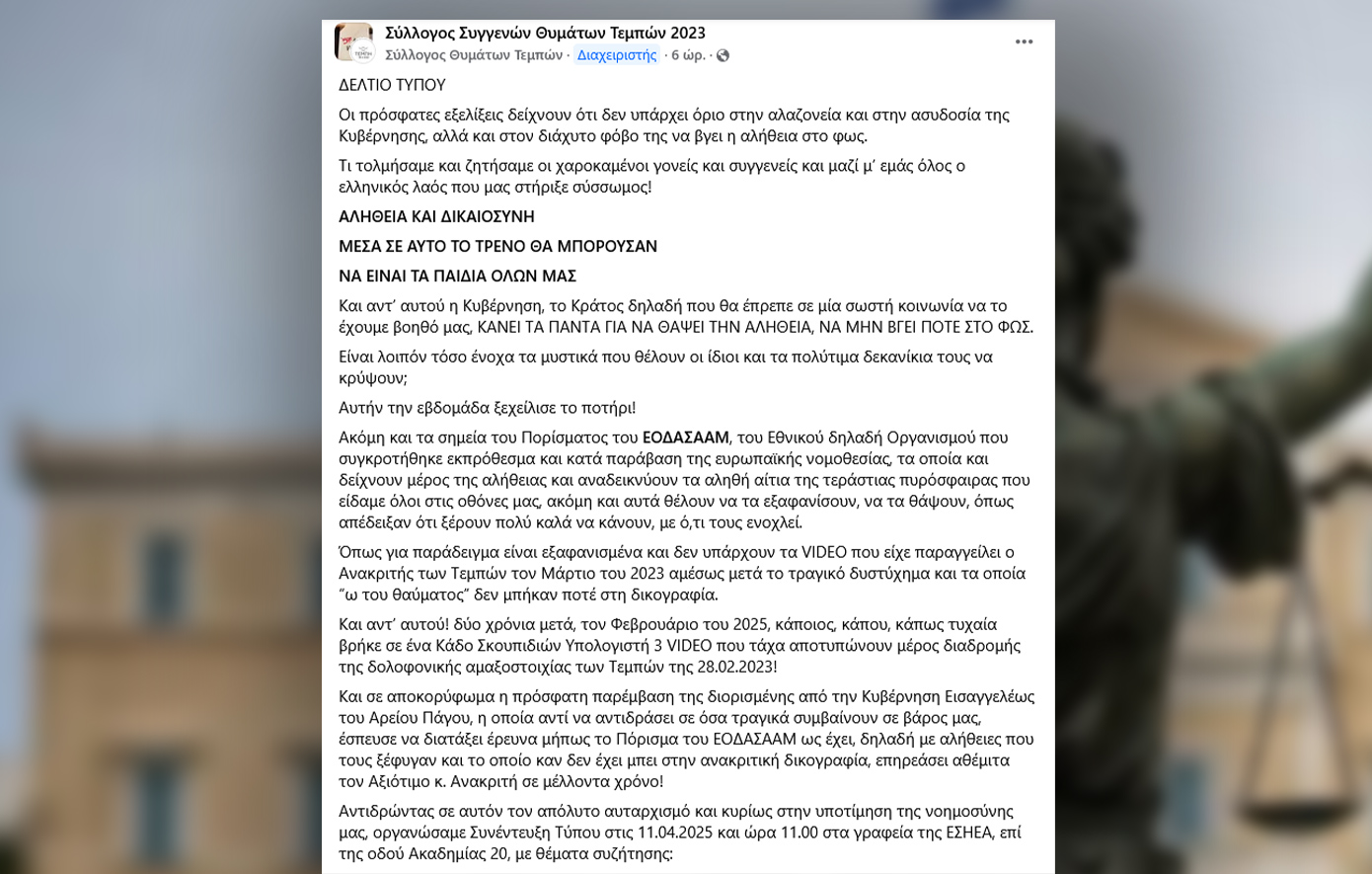 Όπως για παράδειγμα είναι εξαφανισμένα και δεν υπάρχουν τα VIDEO που είχε παραγγείλει ο Ανακριτής των Τεμπών τον Μάρτιο του 2023 αμέσως μετά το τραγικό δυστύχημα και τα οποία “ω του θαύματος” δεν μπήκαν ποτέ στη δικογραφία.