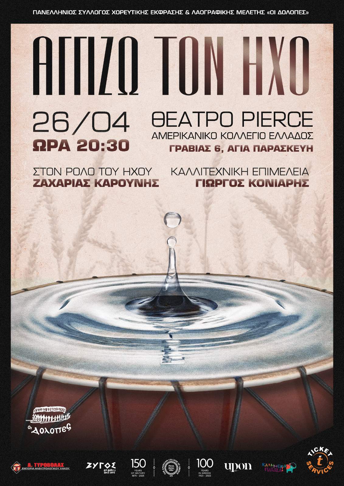 Ο Πανελλήνιος Σύλλογος Χορευτικής Έκφρασης και Λαογραφικής Μελέτης «ΟΙ ΔΟΛΟΠΕΣ» παρουσιάζει στις 26 Απριλίου τη Θεματική Παράσταση «Αγγίζω τον Ήχο». Μετά την ευγενική παραχώρηση του θεάτρου, η παράσταση θα γίνει στο Θέατρο Pierce-Αμερικανικό Κολλέγιο Ελλάδος στην Αγία Παρασκευή Αττικής στις 20:30.