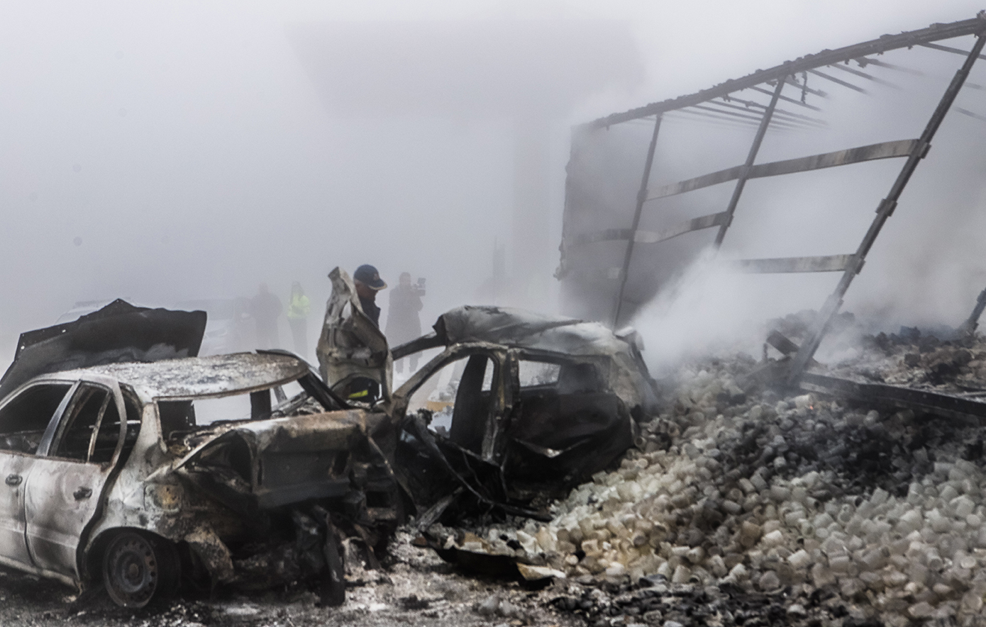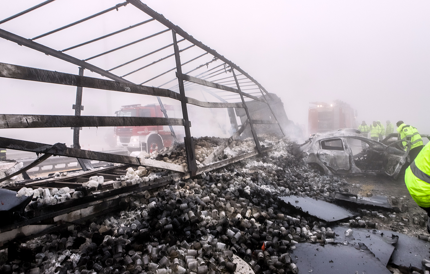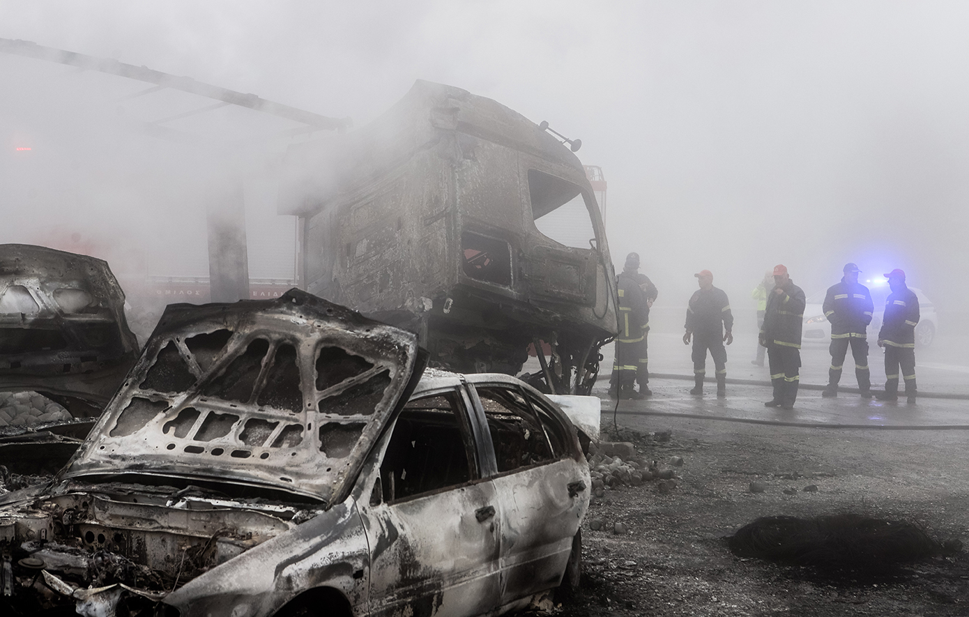 Από το πρώτο όχημα, ο οδηγός κατάφερε να βγει μόνος του ακριβώς λίγα δευτερόλεπτα πριν τυλιχθεί στις φλόγες και καταστραφεί ολοσχερώς. Στο δεύτερο όχημα, τα δυο άτομα που επέβαιναν, κάηκαν ζωντανά.