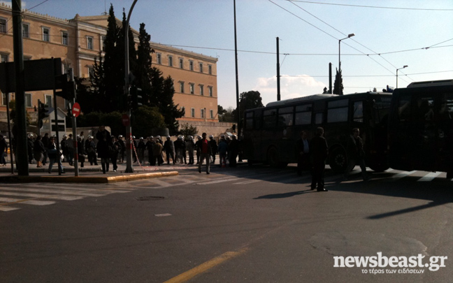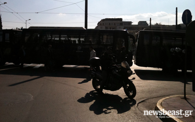 Χωρίς καμία προειδοποίηση αστυνομικές δυνάμεις των ΜΑΤ απέκλεισαν νωρίτερα με κλούβες τη συμβολή της Πανεπιστημίου με τη Βασιλίσσης Σοφίας, μπροστά από το ξενοδοχείο Μεγάλη Βρετάνια, ενόψει της άφιξης του πρωθυπουργού ο οποίος θα έχει στο ξενοδοχείο συνάντηση με επιχειρηματίες.