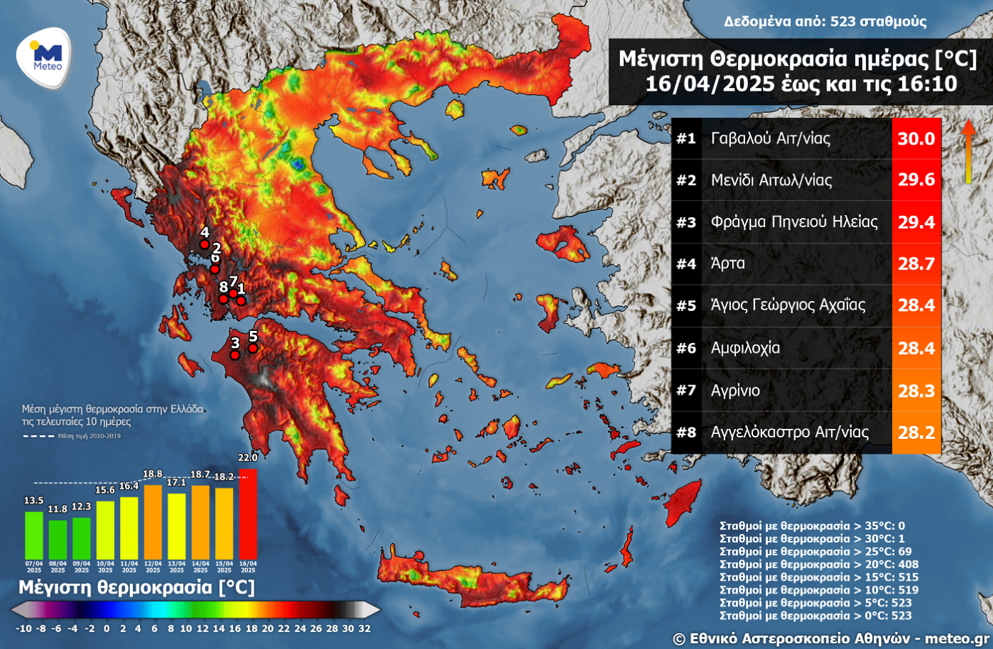 Στον παρακάτω χάρτη αποτυπώνονται οι μέγιστες θερμοκρασίες έως τις 16:10 της Μεγάλης Τετάρτης 16/04, ενώ στον πίνακα παρουσιάζονται οι 8 υψηλότερες μέγιστες τιμές από 523 μετεωρολογικούς σταθμούς: