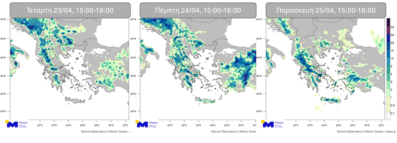 Ενδεικτικά στην παρακάτω ομάδα χαρτών παρουσιάζεται ο αθροιστικός υετός 3ώρου μεταξύ 15:00 και 18:00 για την Τετάρτη 23/04, την Πέμπτη 24/04 και την Παρασκευή 25/04 σύμφωνα με το προγωνστικό μοντέλο του Εθνικού Αστεροσκοπείου Αθηνών