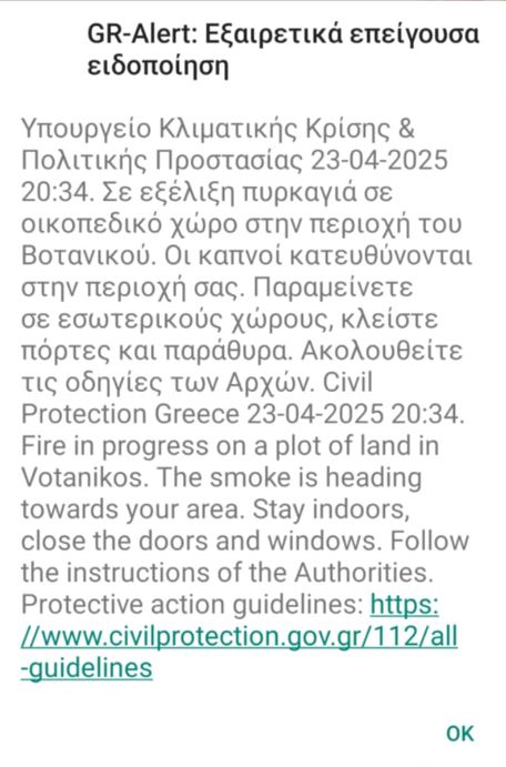 Σε μήνυμα του 112 που έφτασε σε κατοίκους της περιοχής, αναφέρει: «Σε εξέλιξη πυρκαγιά στην περιοχή του Βοτανικού. Οι καπνοί κατευθύνονται στην περιοχή σας. Παραμείνετε σε εσωτερικούς χώρους, κλείστε πόρτες και παράθυρα»